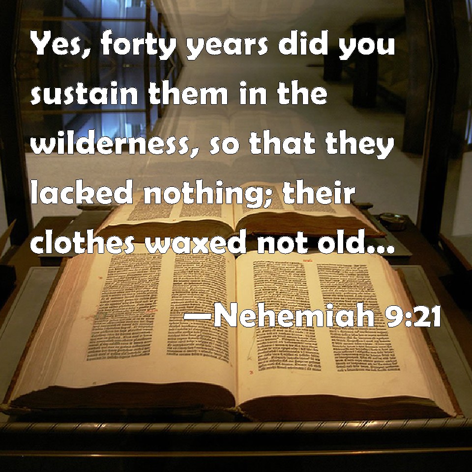 Choose a Background Nehemiah 9:21 Yes, forty years did you sustain them in the wilderness, so that they lacked nothing; their clothes waxed not old, and their feet swelled not. KJV: Yea, forty years didst thou sustain them in the wilderness, so that they lacked nothing; their clothes waxed not old, and their feet swelled not. DRB: Forty years didst thou feed them in the desert, and nothing was wanting to them: their garments did not grow old, and their feet were not worn. DBT: Yea, forty years didst thou sustain them in the wilderness; they lacked nothing; their clothes grew not old, and their feet swelled not. ERV: Yea, forty years didst thou sustain them in the wilderness, and they lacked nothing; their clothes waxed not old, and their feet swelled not. WBT: Yea, forty years didst thou sustain them in the wilderness, so that they lacked nothing; their clothes grew not old, and their feet swelled not. WEB: "Yes, forty years you sustained them in the wilderness. They lacked nothing. Their clothes didn't grow old, and their feet didn't swell. YLT: and forty years Thou hast nourished them in a wilderness; they have not lacked; their garments have not worn out, and their feet have not swelled.Links Nehemiah 9:21 NIV • Nehemiah 9:21 NLT • Nehemiah 9:21 ESV • Nehemiah 9:21 NASB • Nehemiah 9:21 KJV • Nehemiah 9:21 Interlinear • Nehemiah 9:21 Commentaries • Nehemiah 9:21 Parallel Texts • Nehemiah 9:21 Bible Apps • Nehemiah 9:21 Parallel • Bible Hub |
