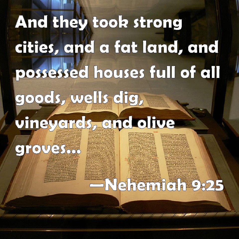 Choose a Background Nehemiah 9:25 And they took strong cities, and a fat land, and possessed houses full of all goods, wells dig, vineyards, and olive groves, and fruit trees in abundance: so they did eat, and were filled, and became fat, and delighted themselves in your great goodness. KJV: And they took strong cities, and a fat land, and possessed houses full of all goods, wells digged, vineyards, and oliveyards, and fruit trees in abundance: so they did eat, and were filled, and became fat, and delighted themselves in thy great goodness. DRB: And they took strong cities and a fat land, and possessed houses full of all goods: cisterns made by others, vine- yards, and oliveyards, and fruit trees in abundance: and they ate, and were filled, and became fat, and abounded with de- light in thy great goodness. DBT: And they took strong cities, and a fat land, and possessed houses full of all good things, wells digged, vineyards and olive-gardens, and fruit trees in abundance. And they did eat and were filled, and became fat, and delighted themselves in thy great goodness. ERV: And they took fenced cities, and a fat land and possessed houses full of good things, cisterns hewn out, vineyards, and oliveyards, and fruit trees in abundance: so they did eat, and were filled, and became fat, and delighted themselves in thy great goodness. WBT: And they took strong cities, and a fat land, and possessed houses full of all goods, wells digged, vineyards and olive-yards, and fruit trees in abundance: so they ate and were filled, and became fat, and delighted themselves in thy great goodness. WEB: They took fortified cities, and a rich land, and possessed houses full of all good things, cisterns dug out, vineyards, and olive groves, and fruit trees in abundance. So they ate, were filled, became fat, and delighted themselves in your great goodness. YLT: And they capture fenced cities, and fat ground, and possess houses full of all good, digged-wells, vineyards, and olive-yards, and fruit-trees in abundance, and they eat, and are satisfied, and become fat, and delight themselves in Thy great goodness.Links Nehemiah 9:25 NIV • Nehemiah 9:25 NLT • Nehemiah 9:25 ESV • Nehemiah 9:25 NASB • Nehemiah 9:25 KJV • Nehemiah 9:25 Interlinear • Nehemiah 9:25 Commentaries • Nehemiah 9:25 Parallel Texts • Nehemiah 9:25 Bible Apps • Nehemiah 9:25 Parallel • Bible Hub |