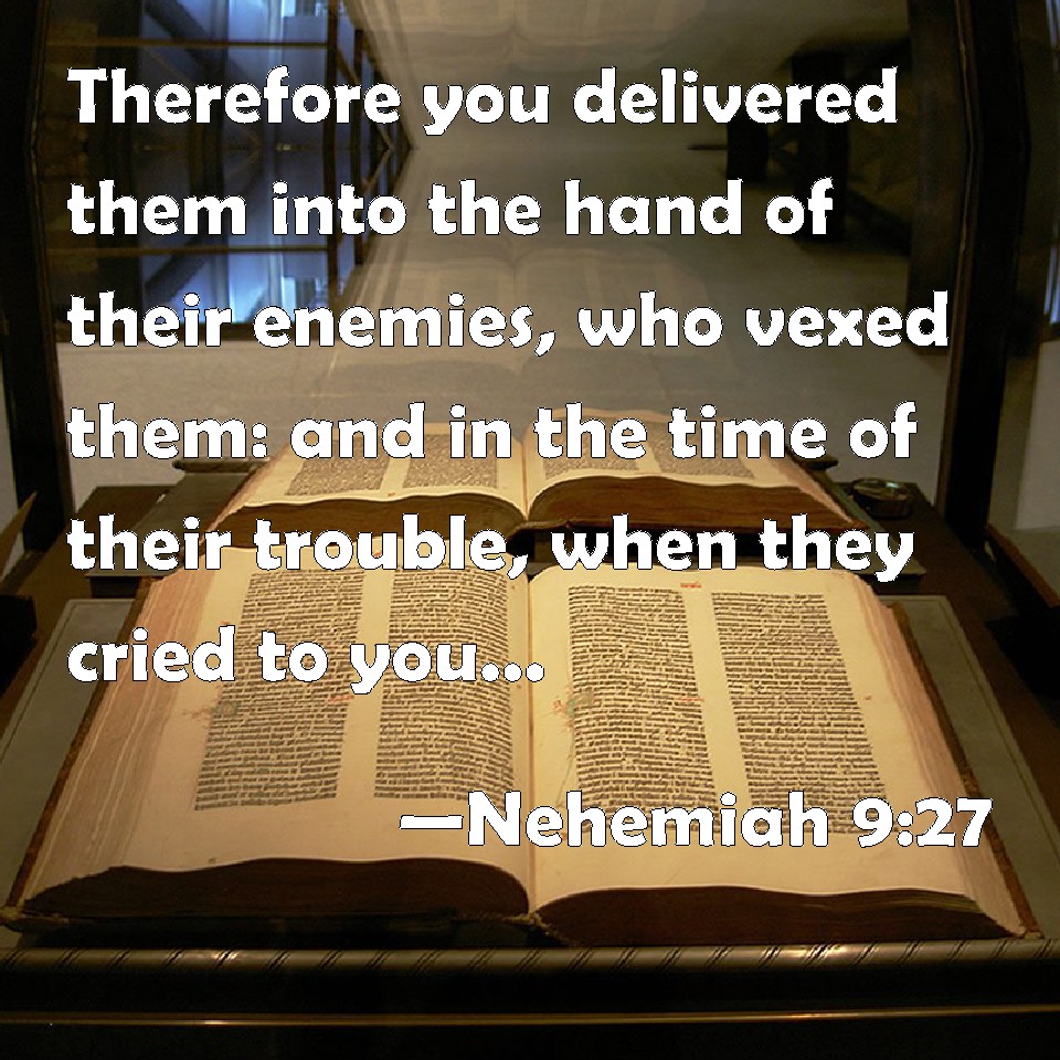 Choose a Background Nehemiah 9:27 Therefore you delivered them into the hand of their enemies, who vexed them: and in the time of their trouble, when they cried to you, you heard them from heaven; and according to your manifold mercies you gave them saviors, who saved them out of the hand of their enemies. KJV: Therefore thou deliveredst them into the hand of their enemies, who vexed them: and in the time of their trouble, when they cried unto thee, thou heardest them from heaven; and according to thy manifold mercies thou gavest them saviours, who saved them out of the hand of their enemies. DRB: And thou gavest them into the hands of their enemies, and they afflicted them. And in the time of their tribulation they cried to thee, and thou heardest from heaven, and according to the multitude of thy tender mercies thou gavest them saviours, to save them from the hands of their enemies. DBT: And thou gavest them into the hand of their oppressors, and they oppressed them; and in the time of their distress, when they cried unto thee, thou heardest them from the heavens, and according to thy manifold mercies thou gavest them saviours, who saved them out of the hand of their oppressors. ERV: Therefore thou deliveredst them into the hand of their adversaries, who distressed them: and in the time of their trouble, when they cried unto thee, thou heardest from heaven; and according to thy manifold mercies thou gavest them saviours who saved them out of the hand of their adversaries. WBT: Therefore thou deliveredst them into the hand of their enemies, who distressed them: and in the time of their trouble, when they cried to thee, thou hearedest them from heaven; and according to thy manifold mercies thou gavest them deliverers, who saved them out of the hand of their enemies. WEB: Therefore you delivered them into the hand of their adversaries, who distressed them. In the time of their trouble, when they cried to you, you heard from heaven; and according to your manifold mercies you gave them saviors who saved them out of the hand of their adversaries. YLT: and Thou givest them into the hand of their adversaries, and they distress them, and in the time of their distress they cry unto Thee, and Thou, from the heavens, dost hear, and, according to Thine abundant mercies, dost give to them saviours, and they save them out of the hand of their adversaries.Links Nehemiah 9:27 NIV • Nehemiah 9:27 NLT • Nehemiah 9:27 ESV • Nehemiah 9:27 NASB • Nehemiah 9:27 KJV • Nehemiah 9:27 Interlinear • Nehemiah 9:27 Commentaries • Nehemiah 9:27 Parallel Texts • Nehemiah 9:27 Bible Apps • Nehemiah 9:27 Parallel • Bible Hub |