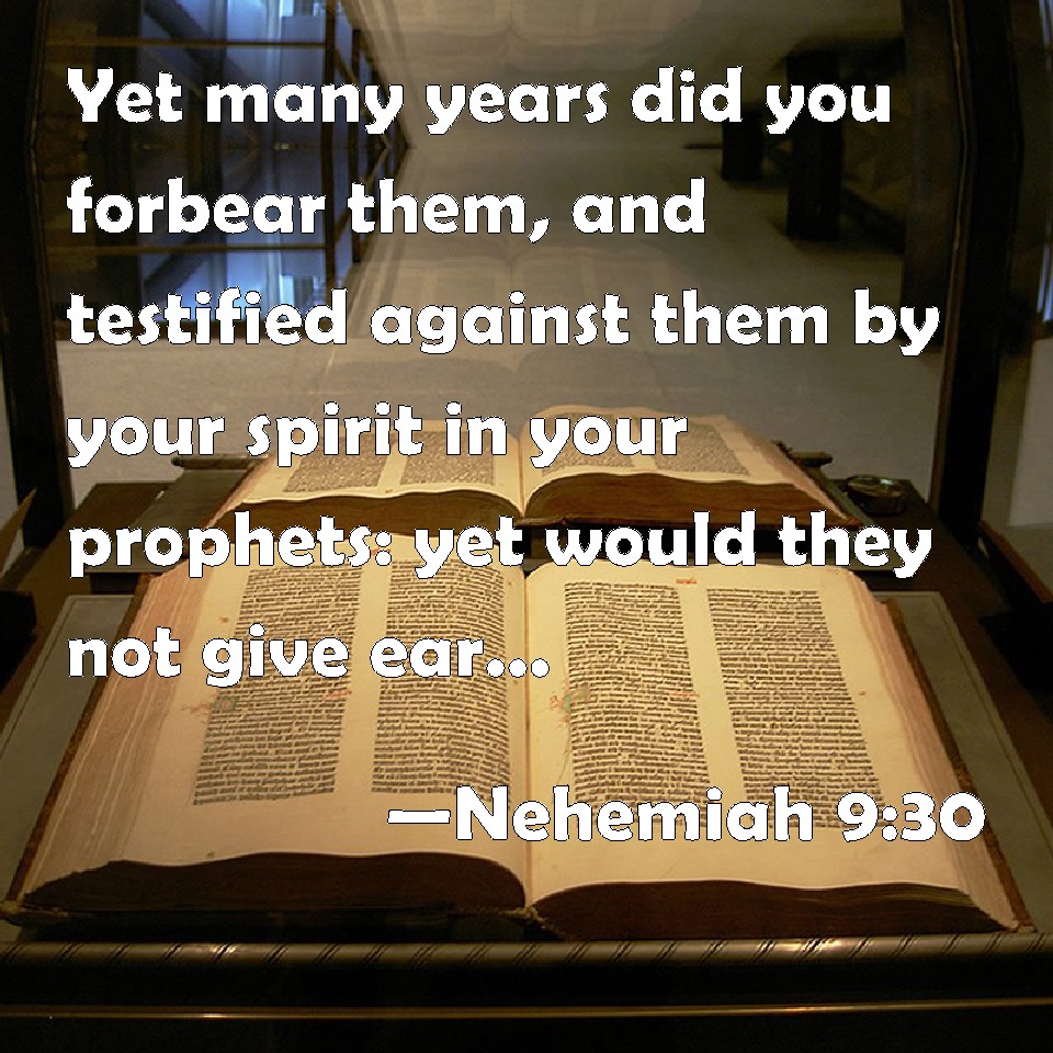 Choose a Background Nehemiah 9:30 Yet many years did you forbear them, and testified against them by your spirit in your prophets: yet would they not give ear: therefore gave you them into the hand of the people of the lands. KJV: Yet many years didst thou forbear them, and testifiedst against them by thy spirit in thy prophets: yet would they not give ear: therefore gavest thou them into the hand of the people of the lands. DRB: And thou didst forbear with them for many years, and didst testify against them by thy spirit by the hand of thy prophets: and they heard not, and thou didst deliver them into the hand of the people of the lands. DBT: And many years didst thou forbear with them, and testifiedst against them by thy Spirit through thy prophets; but they would not give ear: and thou gavest them into the hand of the peoples of the lands. ERV: Yet many years didst thou bear with them, and testifiedst against them by thy spirit through thy prophets: yet would they not give ear: therefore gavest thou them into the hand of the peoples of the lands. WBT: Yet many years didst thou forbear over them, and testifiedst against them by thy spirit in thy prophets: yet would they not give ear: therefore thou gavest them into the hand of the people of the lands. WEB: Yet many years you put up with them, and testified against them by your Spirit through your prophets. Yet would they not give ear. Therefore you gave them into the hand of the peoples of the lands. YLT: 'And Thou drawest over them many years, and testifiest against them by Thy Spirit, by the hand of Thy prophets, and they have not given ear, and Thou dost give them into the hand of peoples of the lands,Links Nehemiah 9:30 NIV • Nehemiah 9:30 NLT • Nehemiah 9:30 ESV • Nehemiah 9:30 NASB • Nehemiah 9:30 KJV • Nehemiah 9:30 Interlinear • Nehemiah 9:30 Commentaries • Nehemiah 9:30 Parallel Texts • Nehemiah 9:30 Bible Apps • Nehemiah 9:30 Parallel • Bible Hub |