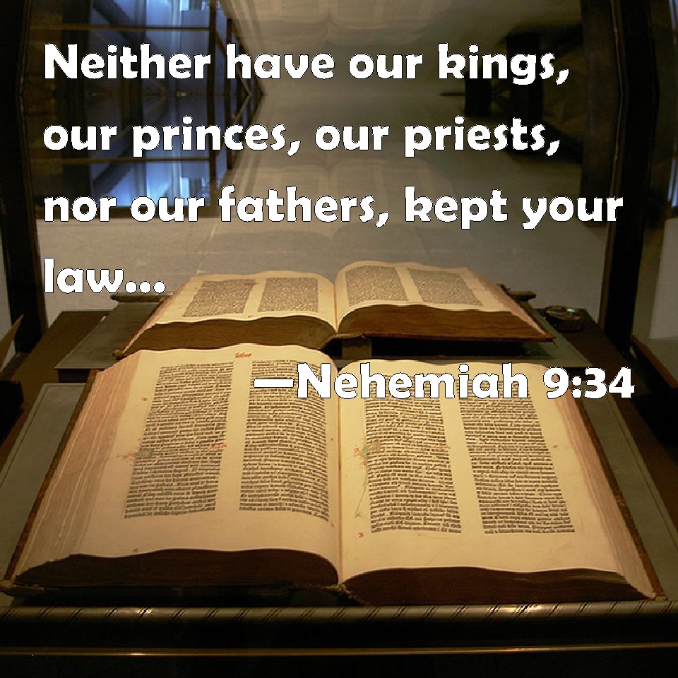 Choose a Background Nehemiah 9:34 Neither have our kings, our princes, our priests, nor our fathers, kept your law, nor listened to your commandments and your testimonies, with which you did testify against them. KJV: Neither have our kings, our princes, our priests, nor our fathers, kept thy law, nor hearkened unto thy commandments and thy testimonies, wherewith thou didst testify against them. DRB: Our kings, our princes, our priests, and our fathers have not kept thy law, and have not minded thy commandments, and thy testimonies which thou hast testified among them. DBT: And our kings, our princes, our priests, and our fathers, have not performed thy law, nor hearkened unto thy commandments and thy testimonies, wherewith thou didst testify against them. ERV: neither have our kings, our princes, our priests, nor our fathers, kept thy law, nor hearkened unto thy commandments and thy testimonies, wherewith thou didst testify against them. WBT: Neither have our kings, our princes, our priests, nor our fathers, kept thy law, nor hearkened to thy commandments and thy testimonies, with which thou didst testify against them. WEB: neither have our kings, our princes, our priests, nor our fathers, kept your law, nor listened to your commandments and your testimonies with which you testified against them. YLT: and our kings, our heads, our priests, and our fathers, have not done Thy law, nor attended unto Thy commands, and to Thy testimonies, that Thou hast testified against them;Links Nehemiah 9:34 NIV • Nehemiah 9:34 NLT • Nehemiah 9:34 ESV • Nehemiah 9:34 NASB • Nehemiah 9:34 KJV • Nehemiah 9:34 Interlinear • Nehemiah 9:34 Commentaries • Nehemiah 9:34 Parallel Texts • Nehemiah 9:34 Bible Apps • Nehemiah 9:34 Parallel • Bible Hub |