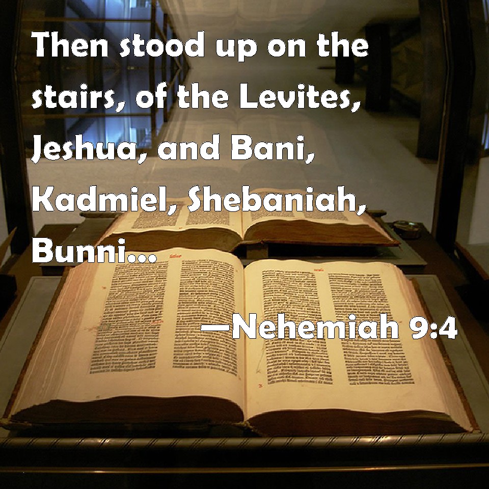 Choose a Background Nehemiah 9:4 Then stood up on the stairs, of the Levites, Jeshua, and Bani, Kadmiel, Shebaniah, Bunni, Sherebiah, Bani, and Chenani, and cried with a loud voice to the LORD their God. KJV: Then stood up upon the stairs, of the Levites, Jeshua, and Bani, Kadmiel, Shebaniah, Bunni, Sherebiah, Bani, and Chenani, and cried with a loud voice unto the LORD their God. DRB: And there stood up upon the seep of the Levites, Josue, and Bani, and Cedmihel, Sabania, Bonni, Sarebias, Bani, and Chanani: and they cried with a loud voice to the Lord their God. DBT: Then stood up upon the platform of the Levites, Jeshua, and Bani, Kadmiel, Shebaniah, Bunni, Sherebiah, Bani, Chenani, and cried with a loud voice to Jehovah their God. ERV: Then stood up upon the stairs of the Levites, Jeshua, and Bani, Kadmiel, Shebaniah, Bunni, Sherebiah, Bani, and Chenani, and cried with a loud voice unto the LORD their God. WBT: Then stood upon the stairs, of the Levites, Jeshua, and Bani, Kadmiel, Shebaniah, Bunni, Sherebiah, Bani, and Chenani, and cried with a loud voice to the LORD their God. WEB: Then stood up on the stairs of the Levites, Jeshua, and Bani, Kadmiel, Shebaniah, Bunni, Sherebiah, Bani, [and] Chenani, and cried with a loud voice to Yahweh their God. YLT: And there stand up on the ascent, of the Levites, Jeshua, and Bani, Kadmiel, Shebaniah, Bunni, Sherebiah, Bani, Chenani, and they cry with a loud voice unto Jehovah their God.Links Nehemiah 9:4 NIV • Nehemiah 9:4 NLT • Nehemiah 9:4 ESV • Nehemiah 9:4 NASB • Nehemiah 9:4 KJV • Nehemiah 9:4 Interlinear • Nehemiah 9:4 Commentaries • Nehemiah 9:4 Parallel Texts • Nehemiah 9:4 Bible Apps • Nehemiah 9:4 Parallel • Bible Hub |