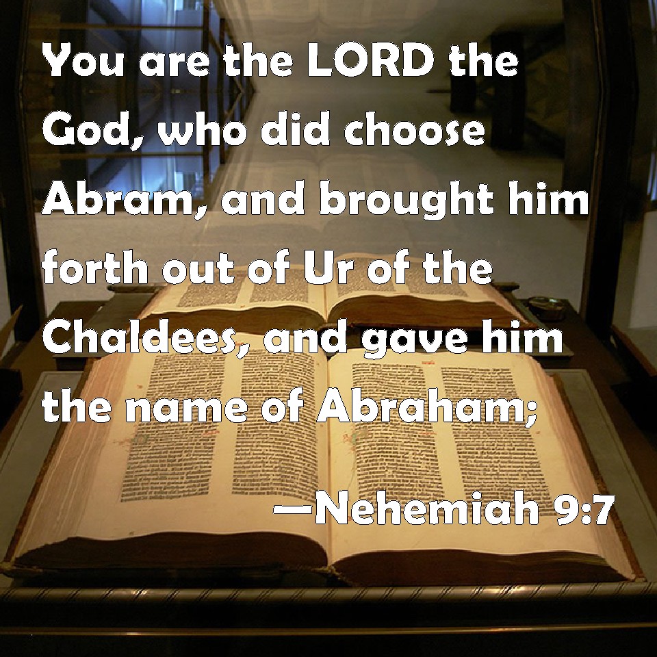 Choose a Background Nehemiah 9:7 You are the LORD the God, who did choose Abram, and brought him forth out of Ur of the Chaldees, and gave him the name of Abraham; KJV: Thou art the LORD the God, who didst choose Abram, and broughtest him forth out of Ur of the Chaldees, and gavest him the name of Abraham; DRB: Thou, O Lord God, art he who chosest Abram, and broughtest him forth out of the fire of the Chaldeans, and gavest him the name of Abraham. DBT: Thou art the Same, Jehovah Elohim, who didst choose Abram and broughtest him forth out of Ur of the Chaldees, and gavest him the name of Abraham; ERV: Then art the LORD the God, who didst choose Abram and broughtest him forth out of Ur of the Chaldees, and gavest him the name of Abraham; WBT: Thou art the LORD the God, who chosest Abram, and broughtest him forth from Ur of the Chaldees, and gavest him the name of Abraham; WEB: You are Yahweh, the God who chose Abram, and brought him out of Ur of the Chaldees, and gave him the name of Abraham, YLT: Thou art He, O Jehovah God, who didst fix on Abraham, and didst bring him out from Ur of the Chaldeans, and didst make his name Abraham,Links Nehemiah 9:7 NIV • Nehemiah 9:7 NLT • Nehemiah 9:7 ESV • Nehemiah 9:7 NASB • Nehemiah 9:7 KJV • Nehemiah 9:7 Interlinear • Nehemiah 9:7 Commentaries • Nehemiah 9:7 Parallel Texts • Nehemiah 9:7 Bible Apps • Nehemiah 9:7 Parallel • Bible Hub |