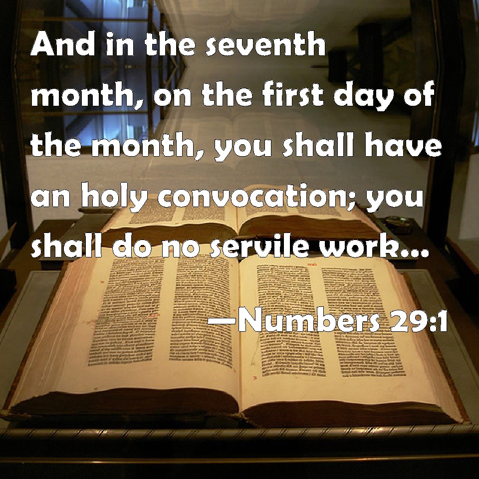 Choose a Background Numbers 29:1 And in the seventh month, on the first day of the month, you shall have an holy convocation; you shall do no servile work: it is a day of blowing the trumpets to you. KJV: And in the seventh month, on the first day of the month, ye shall have an holy convocation; ye shall do no servile work: it is a day of blowing the trumpets unto you. DRB: The first day also of the seventh month shall be venerable and holy unto you; you shall do no servile work therein, because it is the day of the sounding and of trumpets. DBT: And in the seventh month, on the first of the month, ye shall have a holy convocation: no manner of servile work shall ye do; a day of blowing the trumpets shall it be unto you. ERV: And in the seventh month, on the first day of the month, ye shall have an holy convocation; ye shall do no servile work: it is a day of blowing of trumpets unto you. WBT: And in the seventh month, on the first day of the month, ye shall have a holy convocation; ye shall do no servile work: it is a day of blowing the trumpets to you. WEB: "'In the seventh month, on the first day of the month, you shall have a holy convocation; you shall do no servile work: it is a day of blowing of trumpets to you. YLT: 'And in the seventh month, in the first of the month, a holy convocation ye have, ye do no servile work; a day of shouting it is to you;Links Numbers 29:1 NIV • Numbers 29:1 NLT • Numbers 29:1 ESV • Numbers 29:1 NASB • Numbers 29:1 KJV • Numbers 29:1 Interlinear • Numbers 29:1 Commentaries • Numbers 29:1 Parallel Texts • Numbers 29:1 Bible Apps • Numbers 29:1 Parallel • Bible Hub |