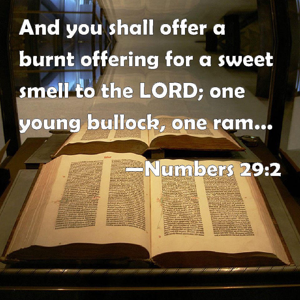 Choose a Background Numbers 29:2 And you shall offer a burnt offering for a sweet smell to the LORD; one young bullock, one ram, and seven lambs of the first year without blemish: KJV: And ye shall offer a burnt offering for a sweet savour unto the LORD; one young bullock, one ram, and seven lambs of the first year without blemish: DRB: And you shall offer a holocaust for a most sweet odour to the Lord, one calf of the herd, one ram and seven lambs of a year old, without blemish. DBT: And ye shall offer a burnt-offering for a sweet odour to Jehovah: one young bullock, one ram, seven yearling lambs without blemish; ERV: And ye shall offer a burnt offering for a sweet savour unto the LORD; one young bullock, one ram, seven he-lambs of the first year without blemish: WBT: And ye shall offer a burnt-offering for a sweet savor to the LORD; one young bullock, one ram, and seven lambs of the first year without blemish: WEB: You shall offer a burnt offering for a pleasant aroma to Yahweh: one young bull, one ram, seven male lambs a year old without blemish; YLT: and ye have prepared a burnt-offering, for sweet fragrance to Jehovah: one bullock, a son of the herd, one ram, seven lambs, sons of a year, perfect ones;Links Numbers 29:2 NIV • Numbers 29:2 NLT • Numbers 29:2 ESV • Numbers 29:2 NASB • Numbers 29:2 KJV • Numbers 29:2 Interlinear • Numbers 29:2 Commentaries • Numbers 29:2 Parallel Texts • Numbers 29:2 Bible Apps • Numbers 29:2 Parallel • Bible Hub |