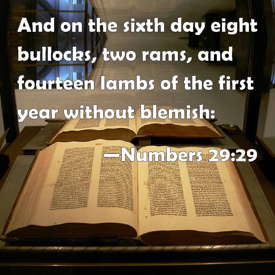 Choose a Background Numbers 29:29 And on the sixth day eight bullocks, two rams, and fourteen lambs of the first year without blemish: KJV: And on the sixth day eight bullocks, two rams, and fourteen lambs of the first year without blemish: DRB: The sixth day you shall offer eight calves, two rams, and fourteen lambs of a year old, without blemish: DBT: And on the sixth day, eight bullocks, two rams, fourteen yearling lambs without blemish; ERV: And on the sixth day eight bullocks, two rams, fourteen he-lambs of the first year without blemish: WBT: And on the sixth day eight bullocks, two rams, and fourteen lambs of the first year without blemish: WEB: "'On the sixth day eight bulls, two rams, fourteen male lambs a year old without blemish; YLT: 'And on the sixth day eight bullocks, two rams, fourteen lambs, sons of a year, perfect ones;Links Numbers 29:29 NIV • Numbers 29:29 NLT • Numbers 29:29 ESV • Numbers 29:29 NASB • Numbers 29:29 KJV • Numbers 29:29 Interlinear • Numbers 29:29 Commentaries • Numbers 29:29 Parallel Texts • Numbers 29:29 Bible Apps • Numbers 29:29 Parallel • Bible Hub |