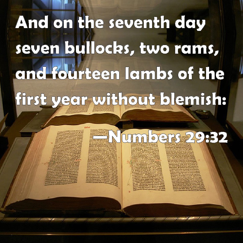 Choose a Background Numbers 29:32 And on the seventh day seven bullocks, two rams, and fourteen lambs of the first year without blemish: KJV: And on the seventh day seven bullocks, two rams, and fourteen lambs of the first year without blemish: DRB: The seventh day you shall offer seven calves and two rams, and fourteen lambs of a year old, without blemish: DBT: And on the seventh day, seven bullocks, two rams, fourteen yearling lambs without blemish; ERV: And on the seventh day seven bullocks, two rams, fourteen he-lambs of the first year without blemish: WBT: And on the seventh day seven bullocks, two rams, and fourteen lambs of the first year without blemish: WEB: "'On the seventh day seven bulls, two rams, fourteen male lambs a year old without blemish; YLT: 'And on the seventh day seven bullocks, two rams, fourteen lambs, sons of a year, perfect ones;Links Numbers 29:32 NIV • Numbers 29:32 NLT • Numbers 29:32 ESV • Numbers 29:32 NASB • Numbers 29:32 KJV • Numbers 29:32 Interlinear • Numbers 29:32 Commentaries • Numbers 29:32 Parallel Texts • Numbers 29:32 Bible Apps • Numbers 29:32 Parallel • Bible Hub |
