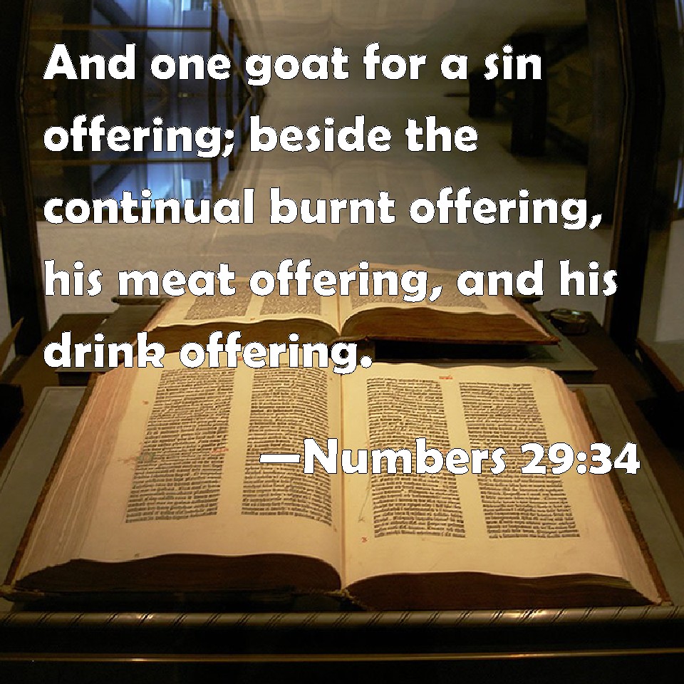 Choose a Background Numbers 29:34 And one goat for a sin offering; beside the continual burnt offering, his meat offering, and his drink offering. KJV: And one goat for a sin offering; beside the continual burnt offering, his meat offering, and his drink offering. DRB: And a buck goat for sin, besides the perpetual holocaust, and the sacrifice and the libation thereof. DBT: and one he-goat for a sin-offering, besides the continual burnt-offering, its oblation and its drink-offering. ERV: and one he-goat for a sin offering; beside the continual burnt offering, the meal offering thereof, and the drink offering thereof. WBT: And one goat for a sin-offering: besides the continual burnt-offering, its meat-offering, and its drink-offering. WEB: and one male goat for a sin offering; besides the continual burnt offering, the meal offering of it, and the drink offering of it. YLT: and one goat, a sin-offering; apart from the continual burnt-offering, its present, and its libation.Links Numbers 29:34 NIV • Numbers 29:34 NLT • Numbers 29:34 ESV • Numbers 29:34 NASB • Numbers 29:34 KJV • Numbers 29:34 Interlinear • Numbers 29:34 Commentaries • Numbers 29:34 Parallel Texts • Numbers 29:34 Bible Apps • Numbers 29:34 Parallel • Bible Hub |