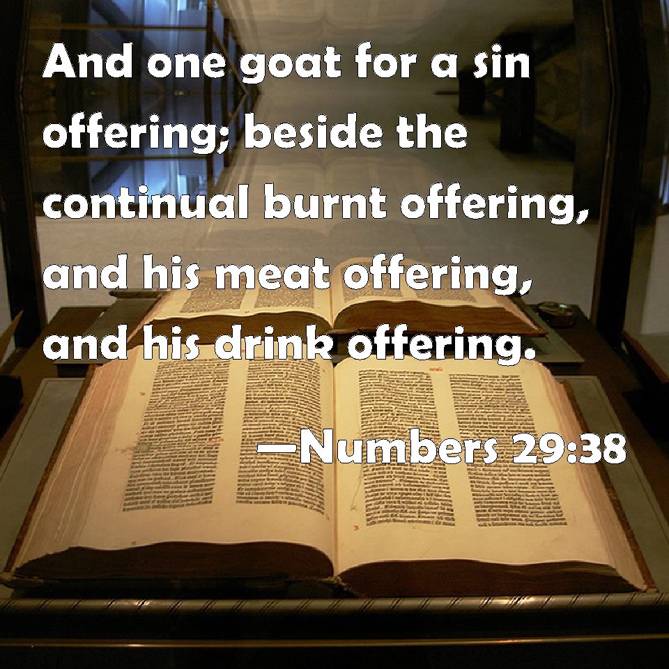 Choose a Background Numbers 29:38 And one goat for a sin offering; beside the continual burnt offering, and his meat offering, and his drink offering. KJV: And one goat for a sin offering; beside the continual burnt offering, and his meat offering, and his drink offering. DRB: And a buck goat for sin, besides the perpetual holocaust, and the sacrifice and the libation thereof. DBT: and one he-goat for a sin-offering, besides the continual burnt-offering and its oblation and its drink-offering. ERV: and one he-goat for a sin offering; beside the continual burnt offering, and the meal offering thereof, and the drink offering thereof. WBT: And one goat for a sin-offering; besides the continual burnt-offering, and its meat-offering, and its drink-offering. WEB: and one male goat for a sin offering, besides the continual burnt offering, and the meal offering of it, and the drink offering of it. YLT: and one goat, a sin-offering; apart from the continual burnt-offering, and its present, and its libation.Links Numbers 29:38 NIV • Numbers 29:38 NLT • Numbers 29:38 ESV • Numbers 29:38 NASB • Numbers 29:38 KJV • Numbers 29:38 Interlinear • Numbers 29:38 Commentaries • Numbers 29:38 Parallel Texts • Numbers 29:38 Bible Apps • Numbers 29:38 Parallel • Bible Hub |