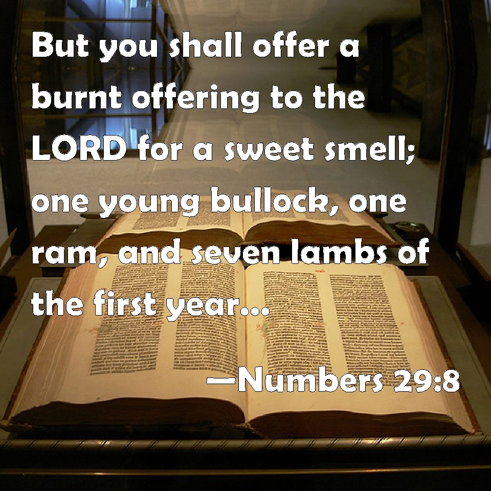 Choose a Background Numbers 29:8 But you shall offer a burnt offering to the LORD for a sweet smell; one young bullock, one ram, and seven lambs of the first year; they shall be to you without blemish: KJV: But ye shall offer a burnt offering unto the LORD for a sweet savour; one young bullock, one ram, and seven lambs of the first year; they shall be unto you without blemish: DRB: And you shall offer a holocaust to the Lord for a most sweet odour, one calf of the herd, one ram, and seven lambs of a year old, without blemish: DBT: And ye shall present a burnt-offering to Jehovah for a sweet odour: one young bullock, one ram, seven yearling lambs (without blemish shall they be unto you); ERV: but ye shall offer a burnt offering unto the LORD for a sweet savour; one young bullock, one ram, seven he-lambs of the first year; they shall be unto you without blemish: WBT: But ye shall offer a burnt-offering to the LORD for a sweet savor; one young bullock, one ram, and seven lambs of the first year; they shall be to you without blemish: WEB: but you shall offer a burnt offering to Yahweh for a pleasant aroma: one young bull, one ram, seven male lambs a year old; they shall be to you without blemish; YLT: and ye have brought near a burnt-offering to Jehovah, a sweet fragrance, one bullock, a son of the herd, one ram, seven lambs, sons of a year, perfect ones they are for you,Links Numbers 29:8 NIV • Numbers 29:8 NLT • Numbers 29:8 ESV • Numbers 29:8 NASB • Numbers 29:8 KJV • Numbers 29:8 Interlinear • Numbers 29:8 Commentaries • Numbers 29:8 Parallel Texts • Numbers 29:8 Bible Apps • Numbers 29:8 Parallel • Bible Hub |