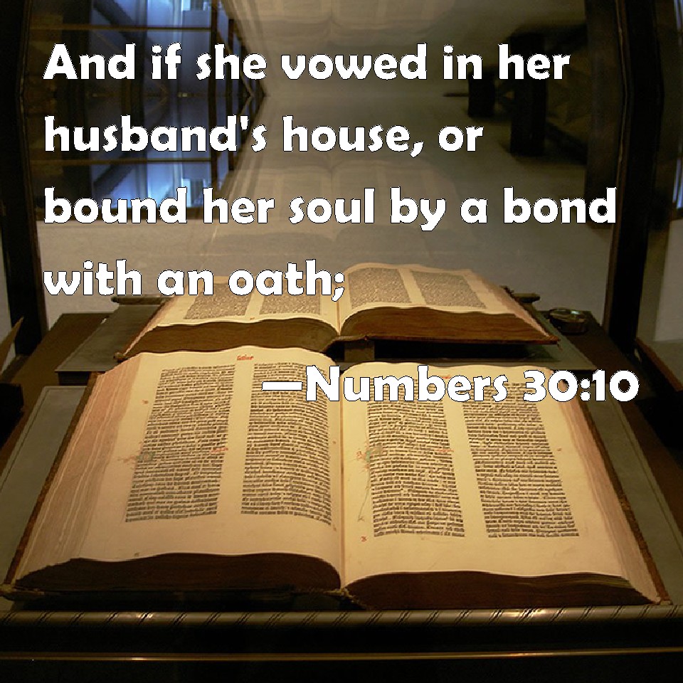 Choose a Background Numbers 30:10 And if she vowed in her husband's house, or bound her soul by a bond with an oath; KJV: And if she vowed in her husband's house, or bound her soul by a bond with an oath; DRB: If the wife in the house of her husband, hath bound herself by vow and by oath, DBT: And if she have vowed in her husband's house, or have bound her soul by an oath with a bond, ERV: And if she vowed in her husband's house, or bound her soul by a bond with an oath, WBT: And if she vowed in her husband's house, or bound her soul by a bond with an oath; WEB: "If she vowed in her husband's house, or bound her soul by a bond with an oath, YLT: And if in the house of her husband she hath vowed, or hath bound a bond on her soul with an oath,Links Numbers 30:10 NIV • Numbers 30:10 NLT • Numbers 30:10 ESV • Numbers 30:10 NASB • Numbers 30:10 KJV • Numbers 30:10 Interlinear • Numbers 30:10 Commentaries • Numbers 30:10 Parallel Texts • Numbers 30:10 Bible Apps • Numbers 30:10 Parallel • Bible Hub |