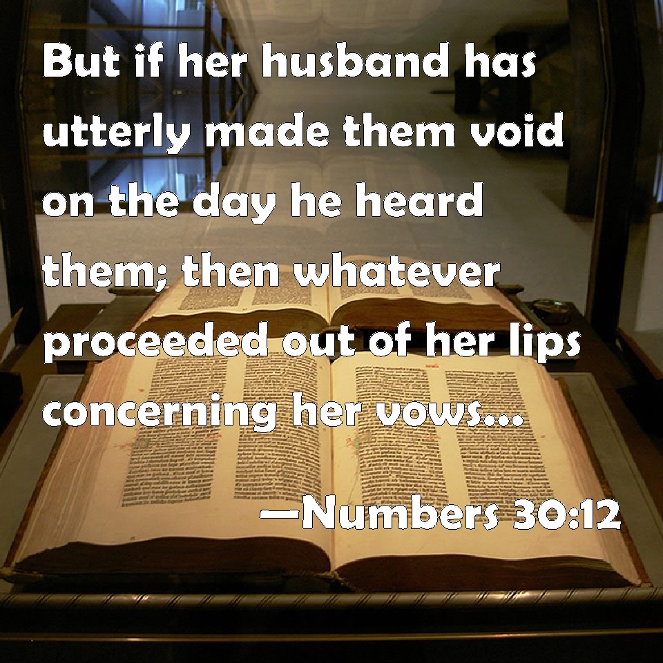 Choose a Background Numbers 30:12 But if her husband has utterly made them void on the day he heard them; then whatever proceeded out of her lips concerning her vows, or concerning the bond of her soul, shall not stand: her husband has made them void; and the LORD shall forgive her. KJV: But if her husband hath utterly made them void on the day he heard them; then whatsoever proceeded out of her lips concerning her vows, or concerning the bond of her soul, shall not stand: her husband hath made them void; and the LORD shall forgive her. DRB: But if forthwith he gainsay it, she shall not be bound by the promise: because her husband gainsaid it, and the Lord will be merciful to her. DBT: But if her husband have expressly annulled them on the day that he heard them, then nothing of that which is gone out of her lips as to her vows or the bond on her soul, shall stand: her husband hath annulled them; and Jehovah will pardon her. ERV: But if her husband made them null and void in the day that he heard them; then whatsoever proceeded out of her lips concerning her vows, or concerning the bond of her soul, shall not stand: her husband hath made them void; and the LORD shall forgive her. WBT: But if her husband hath utterly made them void on the day he heard them; then whatever proceeded out of her lips concerning her vows, or concerning the bond of her soul, shall not stand: her husband hath made them void; and the LORD shall forgive her. WEB: But if her husband made them null and void in the day that he heard them, then whatever proceeded out of her lips concerning her vows, or concerning the bond of her soul, shall not stand: her husband has made them void; and Yahweh will forgive her. YLT: And if her husband doth certainly break them in the day of his hearing, none of the outgoing of her lips concerning her vows, or concerning the bond of her soul, is established — her husband hath broken them — and Jehovah is propitious to her.Links Numbers 30:12 NIV • Numbers 30:12 NLT • Numbers 30:12 ESV • Numbers 30:12 NASB • Numbers 30:12 KJV • Numbers 30:12 Interlinear • Numbers 30:12 Commentaries • Numbers 30:12 Parallel Texts • Numbers 30:12 Bible Apps • Numbers 30:12 Parallel • Bible Hub |