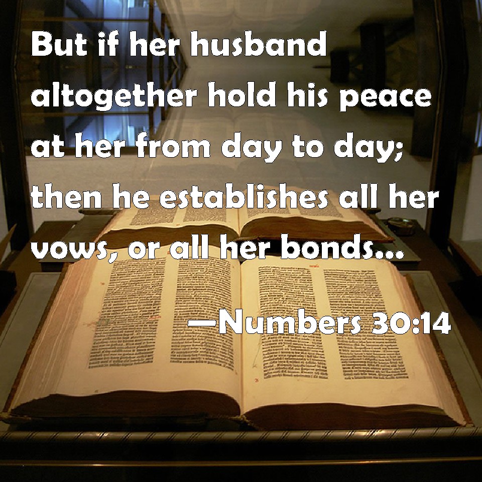 Choose a Background Numbers 30:14 But if her husband altogether hold his peace at her from day to day; then he establishes all her vows, or all her bonds, which are on her: he confirms them, because he held his peace at her in the day that he heard them. KJV: But if her husband altogether hold his peace at her from day to day; then he establisheth all her vows, or all her bonds, which are upon her: he confirmeth them, because he held his peace at her in the day that he heard them. DRB: But if the husband hearing it hold his peace, and defer the declaring his mind till another day: whatsoever she had vowed and promised, she shall fulfil: because immediately as he heard it, he held his peace. DBT: And if her husband be altogether silent at her from day to day, then he hath established all her vows or all her bonds which are upon her; he hath confirmed them, for he hath been silent at her in the day that he heard them. ERV: But if her husband altogether hold his peace at her from day to day; then he establisheth all her vows, or all her bonds, which are upon her: he hath established them, because he held his peace at her in the day that he heard them. WBT: But if her husband altogether holds his peace at her from day to day; then he establisheth all her vows, or all her bonds, which are upon her: he confirmeth them, because he held his peace at her in the day that he heard them. WEB: But if her husband altogether hold his peace at her from day to day, then he establishes all her vows, or all her bonds, which are on her: he has established them, because he held his peace at her in the day that he heard them. YLT: and if her husband certainly keep silent at her, from day unto day, then he hath established all her vows, or all her bonds which are upon her; he hath established them, for he hath kept silent at her in the day of his hearing;Links Numbers 30:14 NIV • Numbers 30:14 NLT • Numbers 30:14 ESV • Numbers 30:14 NASB • Numbers 30:14 KJV • Numbers 30:14 Interlinear • Numbers 30:14 Commentaries • Numbers 30:14 Parallel Texts • Numbers 30:14 Bible Apps • Numbers 30:14 Parallel • Bible Hub |