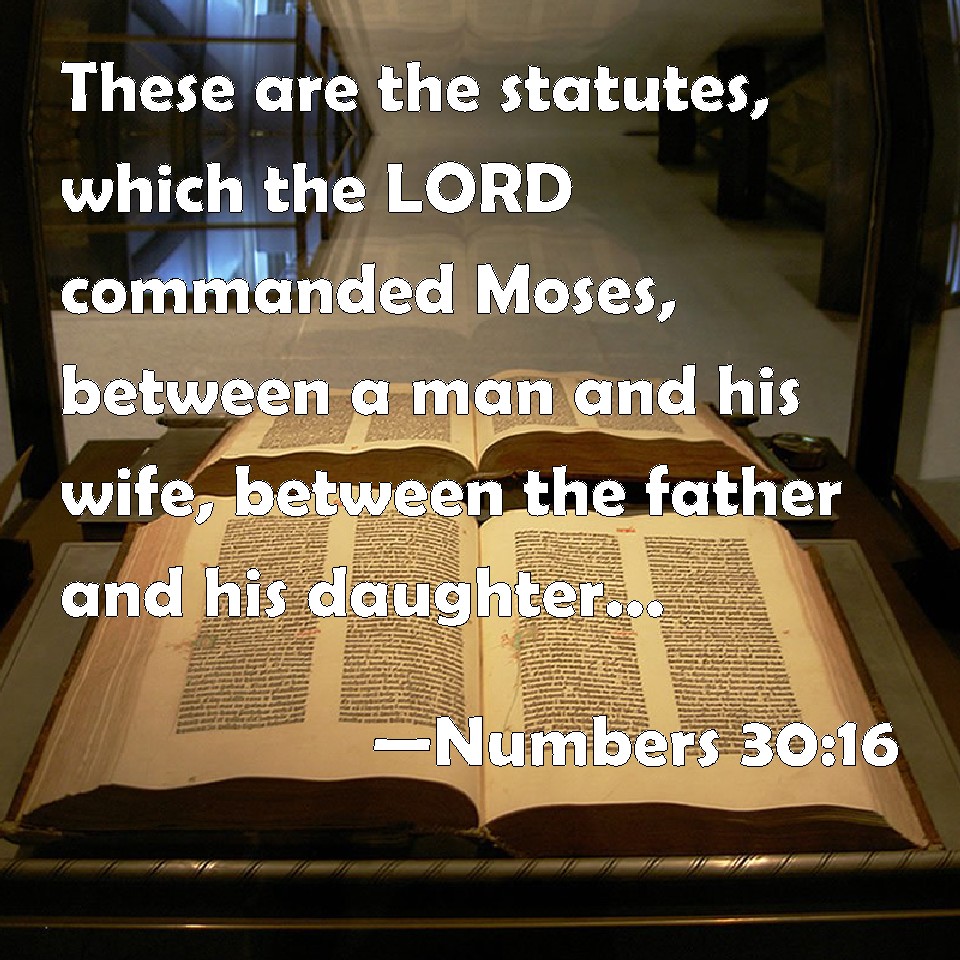 Choose a Background Numbers 30:16 These are the statutes, which the LORD commanded Moses, between a man and his wife, between the father and his daughter, being yet in her youth in her father's house. KJV: These are the statutes, which the LORD commanded Moses, between a man and his wife, between the father and his daughter, being yet in her youth in her father's house. DRB: These are the laws which the Lord appointed to Moses between the husband and the wife, between the father and the daughter that is as yet but a girl in age, or that abideth in her father's house. DBT: These are the statutes, which Jehovah commanded Moses, between a man and his wife, between a father and his daughter, in her youth in her father's house. ERV: These are the statutes, which the LORD commanded Moses, between a man and his wife, between a father and his daughter, being in her youth, in her father's house. WBT: These are the statutes which the LORD commanded Moses, between a man and his wife, between the father and his daughter, being yet in her youth in her father's house. WEB: These are the statutes, which Yahweh commanded Moses, between a man and his wife, between a father and his daughter, being in her youth, in her father's house. YLT: These are the statutes which Jehovah hath commanded Moses between a man and his wife, between a father and his daughter, in her youth, in the house of her father.Links Numbers 30:16 NIV • Numbers 30:16 NLT • Numbers 30:16 ESV • Numbers 30:16 NASB • Numbers 30:16 KJV • Numbers 30:16 Interlinear • Numbers 30:16 Commentaries • Numbers 30:16 Parallel Texts • Numbers 30:16 Bible Apps • Numbers 30:16 Parallel • Bible Hub |