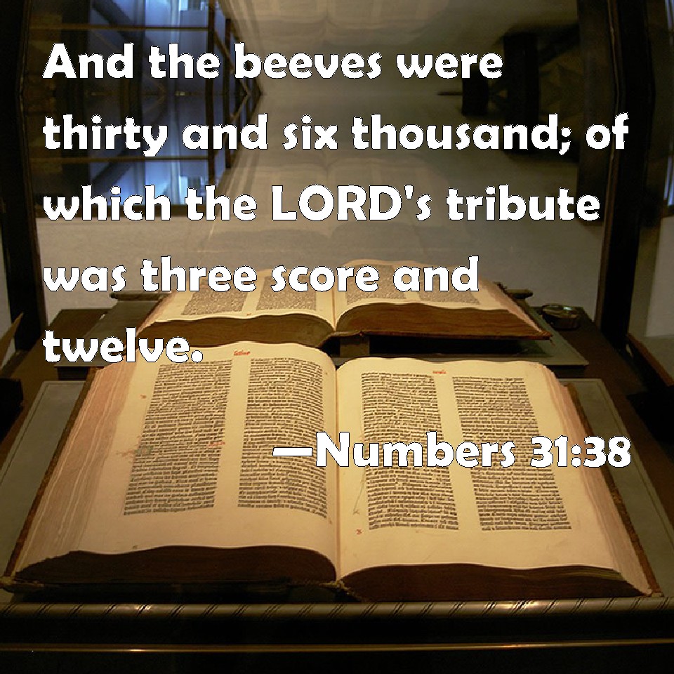 Numbers 31:38 And the beeves were thirty and six thousand; of which the LORD's tribute was three score and twelve.