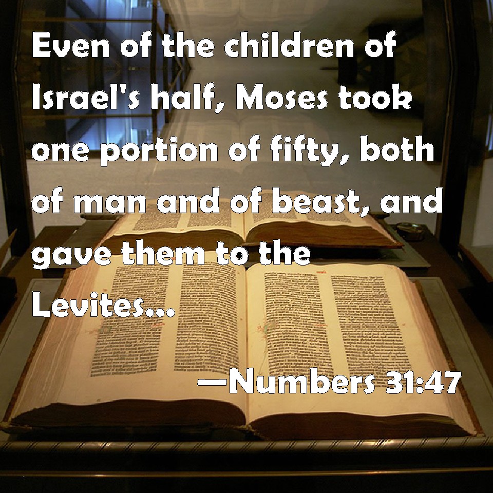 Choose a Background Numbers 31:47 Even of the children of Israel's half, Moses took one portion of fifty, both of man and of beast, and gave them to the Levites, which kept the charge of the tabernacle of the LORD; as the LORD commanded Moses. KJV: Even of the children of Israel's half, Moses took one portion of fifty, both of man and of beast, and gave them unto the Levites, which kept the charge of the tabernacle of the LORD; as the LORD commanded Moses. DRB: Moses took the fiftieth head, and gave it to the Levites that watched in the tabernacle of the Lord, as the Lord had commanded. DBT: ... of the children of Israel's half, Moses took one portion of fifty, of man and of cattle, and gave them to the Levites who kept the charge of the tabernacle of Jehovah; as Jehovah had commanded Moses. ERV: even of the children of Israel's half, Moses took one drawn out of every fifty, both of man and of beast, and gave them unto the Levites, which kept the charge of the tabernacle of the LORD; as the LORD commanded Moses. WBT: Even of the children of Israel's half, Moses took one portion of fifty, both of man and of beast, and gave them to the Levites, who kept the charge of the tabernacle of the LORD; as the LORD commanded Moses. WEB: even of the children of Israel's half, Moses took one drawn out of every fifty, both of man and of animal, and gave them to the Levites, who performed the duty of the tabernacle of Yahweh; as Yahweh commanded Moses. YLT: Moses taketh from the sons of Israel's half the one possession from the fifty, of man and of beast, and giveth them to the Levites keeping the charge of the tabernacle of Jehovah, as Jehovah hath commanded Moses.Links Numbers 31:47 NIV • Numbers 31:47 NLT • Numbers 31:47 ESV • Numbers 31:47 NASB • Numbers 31:47 KJV • Numbers 31:47 Interlinear • Numbers 31:47 Commentaries • Numbers 31:47 Parallel Texts • Numbers 31:47 Bible Apps • Numbers 31:47 Parallel • Bible Hub |