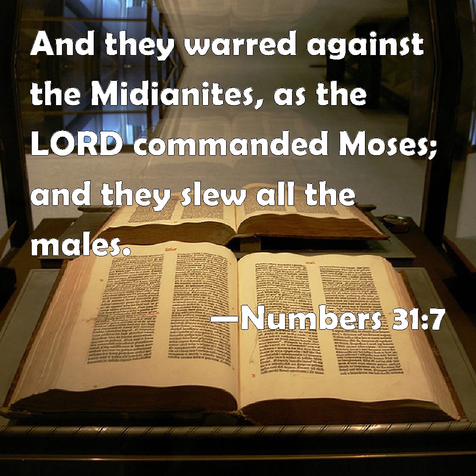 Choose a Background Numbers 31:7 And they warred against the Midianites, as the LORD commanded Moses; and they slew all the males. KJV: And they warred against the Midianites, as the LORD commanded Moses; and they slew all the males. DRB: And when they had fought against the Madianites and had overcome them, they slew all the men. DBT: And they warred against Midian, as Jehovah had commanded Moses, and slew all the males. ERV: And they warred against Midian, as the LORD commanded Moses; and they slew every male. WBT: And they warred against the Midianites, as the LORD commanded Moses; and they slew all the males. WEB: They warred against Midian, as Yahweh commanded Moses; and they killed every male. YLT: And they war against Midian, as Jehovah hath commanded Moses, and slay every male;Links Numbers 31:7 NIV • Numbers 31:7 NLT • Numbers 31:7 ESV • Numbers 31:7 NASB • Numbers 31:7 KJV • Numbers 31:7 Interlinear • Numbers 31:7 Commentaries • Numbers 31:7 Parallel Texts • Numbers 31:7 Bible Apps • Numbers 31:7 Parallel • Bible Hub |
