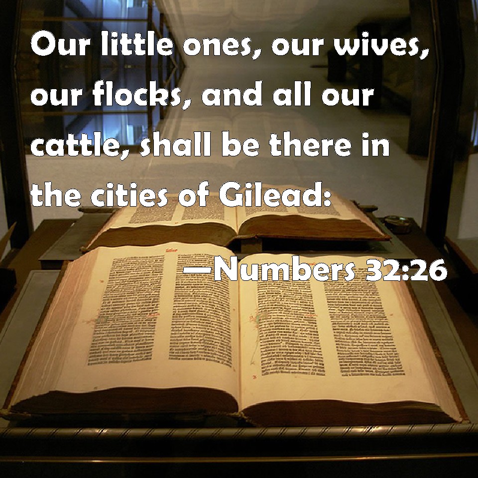 Choose a Background Numbers 32:26 Our little ones, our wives, our flocks, and all our cattle, shall be there in the cities of Gilead: KJV: Our little ones, our wives, our flocks, and all our cattle, shall be there in the cities of Gilead: DRB: We will leave our children, and our wives and sheep and cattle, in the cities of Galaad: DBT: Our little ones, our wives, our cattle, and all our beasts shall be there in the cities of Gilead; ERV: Our little ones, our wives, our flocks, and all our cattle, shall be there in the cities of Gilead: WBT: Our little ones, our wives, our flocks, and all our cattle, shall be there in the cities of Gilead: WEB: Our little ones, our wives, our flocks, and all our livestock, shall be there in the cities of Gilead; YLT: our infants, our wives, our cattle, and all our beasts, are there in cities of Gilead,Links Numbers 32:26 NIV • Numbers 32:26 NLT • Numbers 32:26 ESV • Numbers 32:26 NASB • Numbers 32:26 KJV • Numbers 32:26 Interlinear • Numbers 32:26 Commentaries • Numbers 32:26 Parallel Texts • Numbers 32:26 Bible Apps • Numbers 32:26 Parallel • Bible Hub |