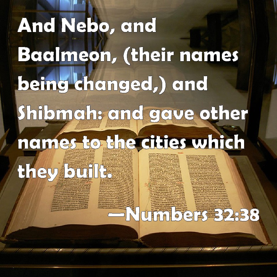Choose a Background Numbers 32:38 And Nebo, and Baalmeon, (their names being changed,) and Shibmah: and gave other names to the cities which they built. KJV: And Nebo, and Baalmeon, (their names being changed,) and Shibmah: and gave other names unto the cities which they builded. DRB: And Nabo, and Baalmeon (their names being changed) and Sabama: giving names to the cities which they had built. DBT: and Nebo, and Baal-meon (of which the names were changed), and Sibmah; and they gave other names to the cities that they built. ERV: and Nebo, and Baal-meon, (their names being changed,) and Sibmah: and gave other names unto the cities which they builded. WBT: And Nebo, and Baal-meon, (their names being changed,) and Shibmah: and gave other names to the cities which they built. WEB: and Nebo, and Baal Meon, (their names being changed), and Sibmah: and they gave other names to the cities which they built. YLT: and Nebo, and Baal-Meon (changed in name), and Shibmah, and they call by these names the names of the cities which they have built.Links Numbers 32:38 NIV • Numbers 32:38 NLT • Numbers 32:38 ESV • Numbers 32:38 NASB • Numbers 32:38 KJV • Numbers 32:38 Interlinear • Numbers 32:38 Commentaries • Numbers 32:38 Parallel Texts • Numbers 32:38 Bible Apps • Numbers 32:38 Parallel • Bible Hub |