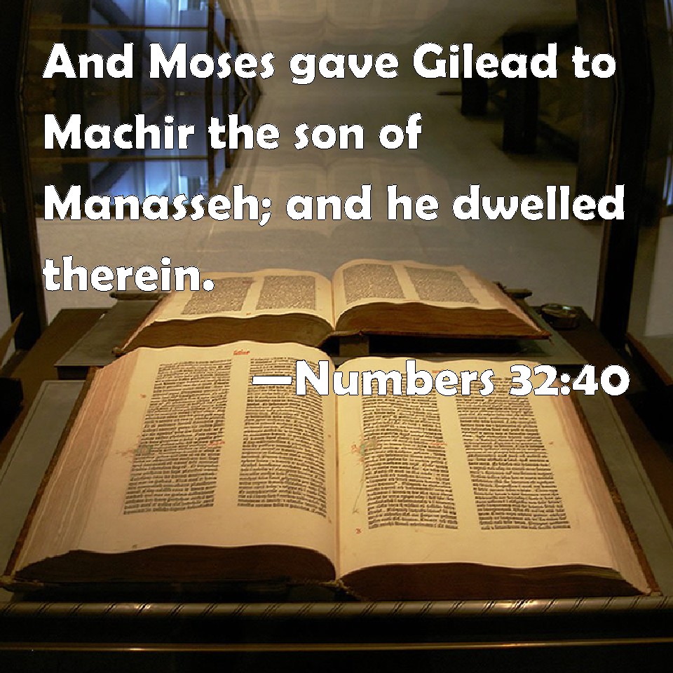 Numbers 32:40 And Moses gave Gilead to Machir the son of Manasseh; and he dwelled therein.