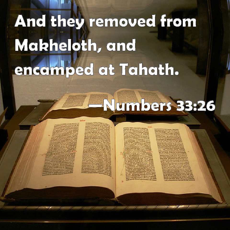 Numbers 33:26 And they removed from Makheloth, and encamped at Tahath.