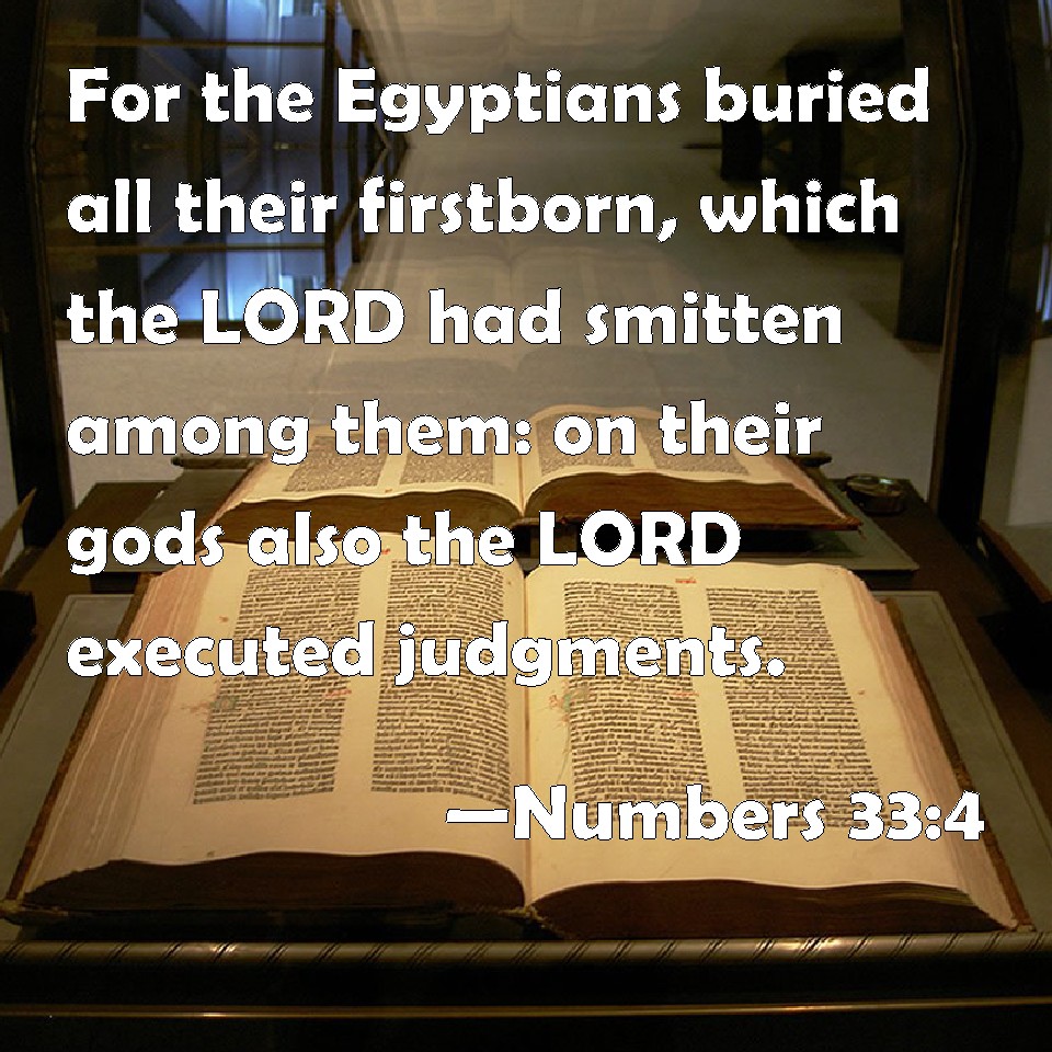 Choose a Background Numbers 33:4 For the Egyptians buried all their firstborn, which the LORD had smitten among them: on their gods also the LORD executed judgments. KJV: For the Egyptians buried all their firstborn, which the LORD had smitten among them: upon their gods also the LORD executed judgments. DRB: Who were burying their firstborn, whom the Lord had slain (upon their gods also he had executed vengeance,) DBT: And the Egyptians buried those whom Jehovah had smitten among them, all the firstborn; and upon their gods Jehovah executed judgments. ERV: while the Egyptians were burying all their firstborn, which the LORD had smitten among them: upon their gods also the LORD executed judgments. WBT: For the Egyptians buried all their first-born, whom the LORD had smitten among them: upon their gods also the LORD executed judgments. WEB: while the Egyptians were burying all their firstborn, whom Yahweh had struck among them: on their gods also Yahweh executed judgments. YLT: and the Egyptians are burying those whom Jehovah hath smitten among them, every first-born, and on their gods hath Jehovah done judgments — Links Numbers 33:4 NIV • Numbers 33:4 NLT • Numbers 33:4 ESV • Numbers 33:4 NASB • Numbers 33:4 KJV • Numbers 33:4 Interlinear • Numbers 33:4 Commentaries • Numbers 33:4 Parallel Texts • Numbers 33:4 Bible Apps • Numbers 33:4 Parallel • Bible Hub |