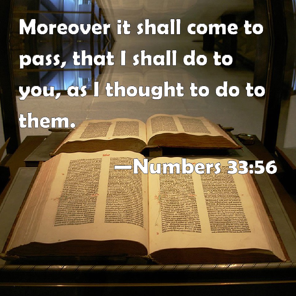 Choose a Background Numbers 33:56 Moreover it shall come to pass, that I shall do to you, as I thought to do to them. KJV: Moreover it shall come to pass, that I shall do unto you, as I thought to do unto them. DRB: And whatsoever I had thought to do to them, I will do to you. DBT: And it shall come to pass that I will do unto you as I thought to do unto them. ERV: And it shall come to pass, that as I thought to do unto them, so will I do unto you. WBT: Moreover, it shall come to pass, that I shall do to you as I thought to do to them. WEB: It shall happen that as I thought to do to them, so will I do to you." YLT: and it hath come to pass, as I thought to do to them — I do to you.'Links Numbers 33:56 NIV • Numbers 33:56 NLT • Numbers 33:56 ESV • Numbers 33:56 NASB • Numbers 33:56 KJV • Numbers 33:56 Interlinear • Numbers 33:56 Commentaries • Numbers 33:56 Parallel Texts • Numbers 33:56 Bible Apps • Numbers 33:56 Parallel • Bible Hub |