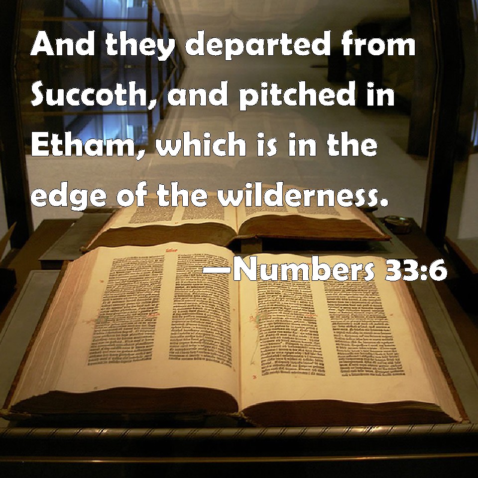 Choose a Background Numbers 33:6 And they departed from Succoth, and pitched in Etham, which is in the edge of the wilderness. KJV: And they departed from Succoth, and pitched in Etham, which is in the edge of the wilderness. DRB: And from Soccoth they came into Etham, which is in the uttermost borders of the wilderness. DBT: And they removed from Succoth and encamped in Etham, which is at the end of the wilderness. ERV: And they journeyed from Succoth, and pitched in Etham, which is in the edge of the wilderness. WBT: And they departed from Succoth, and encamped in Etham, which is in the edge of the wilderness. WEB: They traveled from Succoth, and encamped in Etham, which is in the edge of the wilderness. YLT: And they journey from Succoth, and encamp in Etham, which is in the extremity of the wilderness;Links Numbers 33:6 NIV • Numbers 33:6 NLT • Numbers 33:6 ESV • Numbers 33:6 NASB • Numbers 33:6 KJV • Numbers 33:6 Interlinear • Numbers 33:6 Commentaries • Numbers 33:6 Parallel Texts • Numbers 33:6 Bible Apps • Numbers 33:6 Parallel • Bible Hub |