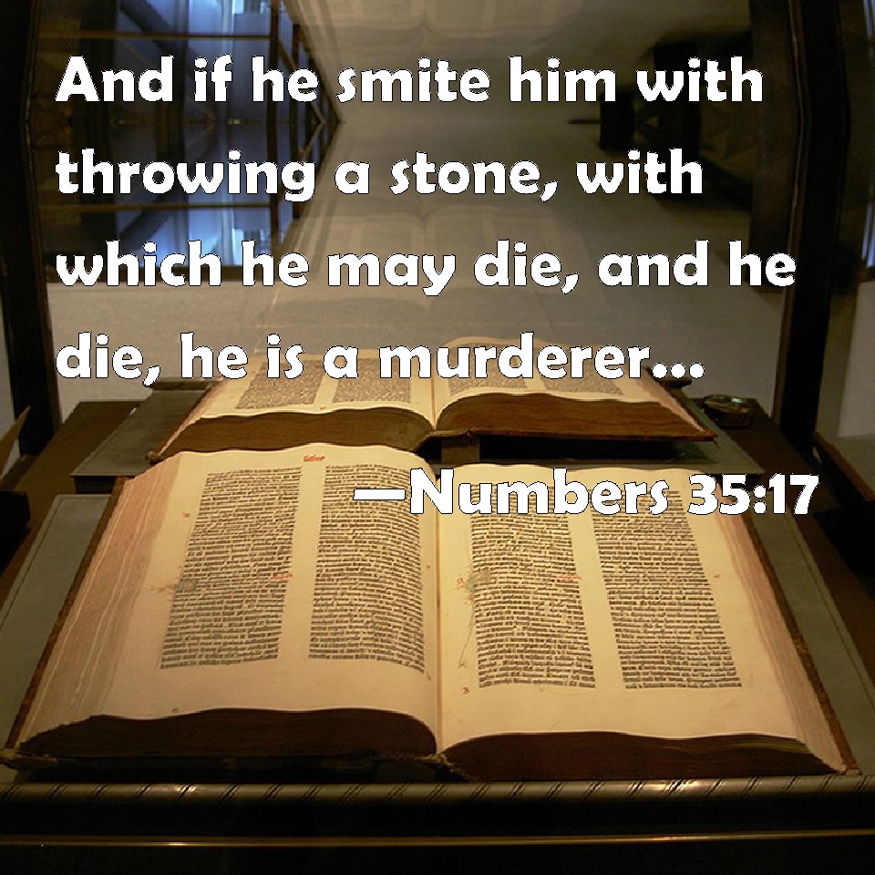 Choose a Background Numbers 35:17 And if he smite him with throwing a stone, with which he may die, and he die, he is a murderer: the murderer shall surely be put to death. KJV: And if he smite him with throwing a stone, wherewith he may die, and he die, he is a murderer: the murderer shall surely be put to death. DRB: If he throw a stone, and he that is struck die: he shall be punished in the same manner. DBT: And if he have smitten him with a stone from the hand, wherewith one may die, and he die, he is a murderer: the murderer shall certainly be put to death. ERV: And if he smote him with a stone in the hand, whereby a man may die, and he died, he is a manslayer: the manslayer shall surely be put to death. WBT: And if he shall smite him by throwing a stone, by which he may die, and he shall die, he is a murderer: the murderer shall surely be put to death. WEB: If he struck him with a stone in the hand, by which a man may die, and he died, he is a murderer: the murderer shall surely be put to death. YLT: And if with a stone in the hand, wherewith he dieth, he hath smitten him, and he dieth, he is a murderer: the murderer is certainly put to death.Links Numbers 35:17 NIV • Numbers 35:17 NLT • Numbers 35:17 ESV • Numbers 35:17 NASB • Numbers 35:17 KJV • Numbers 35:17 Interlinear • Numbers 35:17 Commentaries • Numbers 35:17 Parallel Texts • Numbers 35:17 Bible Apps • Numbers 35:17 Parallel • Bible Hub |