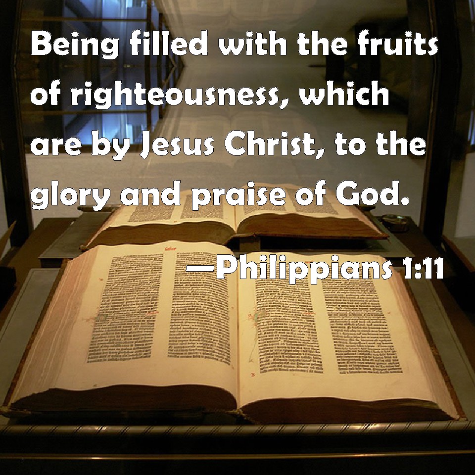 Choose a Background Philippians 1:11 Being filled with the fruits of righteousness, which are by Jesus Christ, to the glory and praise of God. KJV: Being filled with the fruits of righteousness, which are by Jesus Christ, unto the glory and praise of God. DRB: Filled with the fruit of justice, through Jesus Christ, unto the glory and praise of God. DBT: being complete as regards the fruit of righteousness, which is by Jesus Christ, to God's glory and praise. ERV: being filled with the fruits of righteousness, which are through Jesus Christ, unto the glory and praise of God. WBT: Being filled with the fruits of righteousness, which are by Jesus Christ, to the glory and praise of God. WEB: being filled with the fruits of righteousness, which are through Jesus Christ, to the glory and praise of God. YLT: being filled with the fruit of righteousness, that is through Jesus Christ, to the glory and praise of God.Links Philippians 1:11 NIV • Philippians 1:11 NLT • Philippians 1:11 ESV • Philippians 1:11 NASB • Philippians 1:11 KJV • Philippians 1:11 Interlinear • Philippians 1:11 Commentaries • Philippians 1:11 Parallel Texts • Philippians 1:11 Bible Apps • Philippians 1:11 Parallel • Bible Hub |