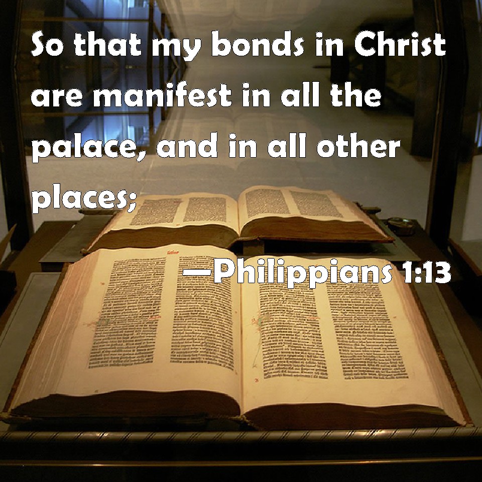 Choose a Background Philippians 1:13 So that my bonds in Christ are manifest in all the palace, and in all other places; KJV: So that my bonds in Christ are manifest in all the palace, and in all other places; DRB: So that my bands are made manifest in Christ, in all the court, and in all other places; DBT: so that my bonds have become manifest as being in Christ in all the praetorium and to all others; ERV: so that my bonds became manifest in Christ throughout the whole praetorian guard, and to all the rest; WBT: So that my bonds in Christ are manifest in all the palace, and in all other places; WEB: so that it became evident to the whole palace guard, and to all the rest, that my bonds are in Christ; YLT: so that my bonds have become manifest in Christ in the whole praetorium, and to the other places — all,Links Philippians 1:13 NIV • Philippians 1:13 NLT • Philippians 1:13 ESV • Philippians 1:13 NASB • Philippians 1:13 KJV • Philippians 1:13 Interlinear • Philippians 1:13 Commentaries • Philippians 1:13 Parallel Texts • Philippians 1:13 Bible Apps • Philippians 1:13 Parallel • Bible Hub |