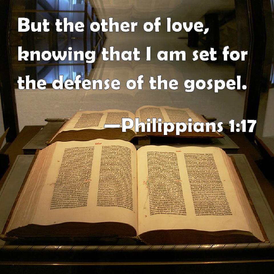 Choose a Background Philippians 1:17 But the other of love, knowing that I am set for the defense of the gospel. KJV: But the other of love, knowing that I am set for the defence of the gospel. DRB: And some out of contention preach Christ not sincerely: supposing that they raise affliction to my bands. DBT: but those out of contention, announce the Christ, not purely, supposing to arouse tribulation for my bonds. ERV: but the other proclaim Christ of faction, not sincerely, thinking to raise up affliction for me in my bonds. WBT: But the other from love, knowing that I am set for the defense of the gospel. WEB: but the latter out of love, knowing that I am appointed for the defense of the Good News. YLT: and the other out of love, having known that for defence of the good news I am set:Links Philippians 1:17 NIV • Philippians 1:17 NLT • Philippians 1:17 ESV • Philippians 1:17 NASB • Philippians 1:17 KJV • Philippians 1:17 Interlinear • Philippians 1:17 Commentaries • Philippians 1:17 Parallel Texts • Philippians 1:17 Bible Apps • Philippians 1:17 Parallel • Bible Hub |