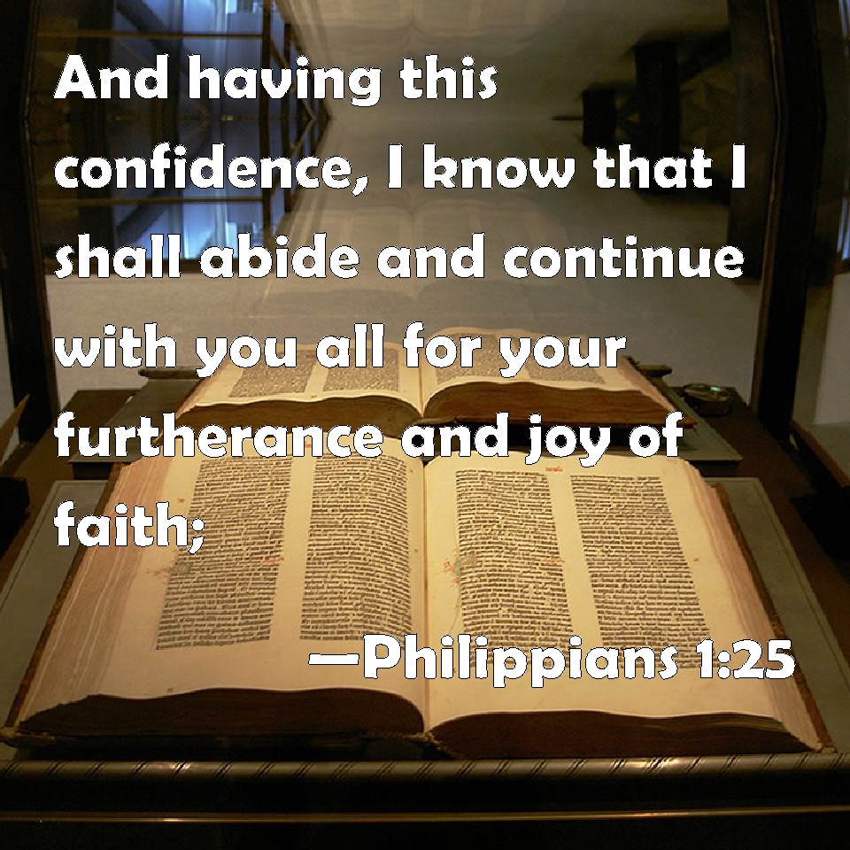 Choose a Background Philippians 1:25 And having this confidence, I know that I shall abide and continue with you all for your furtherance and joy of faith; KJV: And having this confidence, I know that I shall abide and continue with you all for your furtherance and joy of faith; DRB: And having this confidence, I know that I shall abide, and continue with you all, for your furtherance and joy of faith: DBT: and having confidence of this, I know that I shall remain and abide along with you all, for your progress and joy in faith; ERV: And having this confidence, I know that I shall abide, yea, and abide with you all, for your progress and joy in the faith; WBT: And having this confidence, I know that I shall abide and continue with you all for your furtherance and joy of faith; WEB: Having this confidence, I know that I will remain, yes, and remain with you all, for your progress and joy in the faith, YLT: and of this being persuaded, I have known that I shall remain and continue with you all, to your advancement and joy of the faith,Links Philippians 1:25 NIV • Philippians 1:25 NLT • Philippians 1:25 ESV • Philippians 1:25 NASB • Philippians 1:25 KJV • Philippians 1:25 Interlinear • Philippians 1:25 Commentaries • Philippians 1:25 Parallel Texts • Philippians 1:25 Bible Apps • Philippians 1:25 Parallel • Bible Hub |
