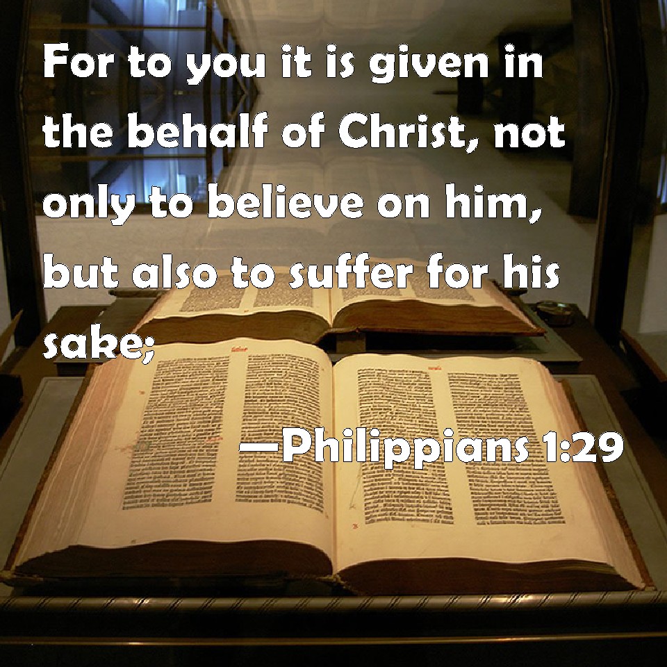 Choose a Background Philippians 1:29 For to you it is given in the behalf of Christ, not only to believe on him, but also to suffer for his sake; KJV: For unto you it is given in the behalf of Christ, not only to believe on him, but also to suffer for his sake; DRB: For unto you it is given for Christ, not only to believe in him, but also to suffer for him. DBT: because to you has been given, as regards Christ, not only the believing on him but the suffering for him also, ERV: because to you it hath been granted in the behalf of Christ, not only to believe on him, but also to suffer in his behalf: WBT: For to you it is given in the behalf of Christ, not only to believe on him, but also to suffer for his sake; WEB: Because it has been granted to you on behalf of Christ, not only to believe in him, but also to suffer on his behalf, YLT: because to you it was granted, on behalf of Christ, not only to believe in him, but also on behalf of him to suffer;Links Philippians 1:29 NIV • Philippians 1:29 NLT • Philippians 1:29 ESV • Philippians 1:29 NASB • Philippians 1:29 KJV • Philippians 1:29 Interlinear • Philippians 1:29 Commentaries • Philippians 1:29 Parallel Texts • Philippians 1:29 Bible Apps • Philippians 1:29 Parallel • Bible Hub |