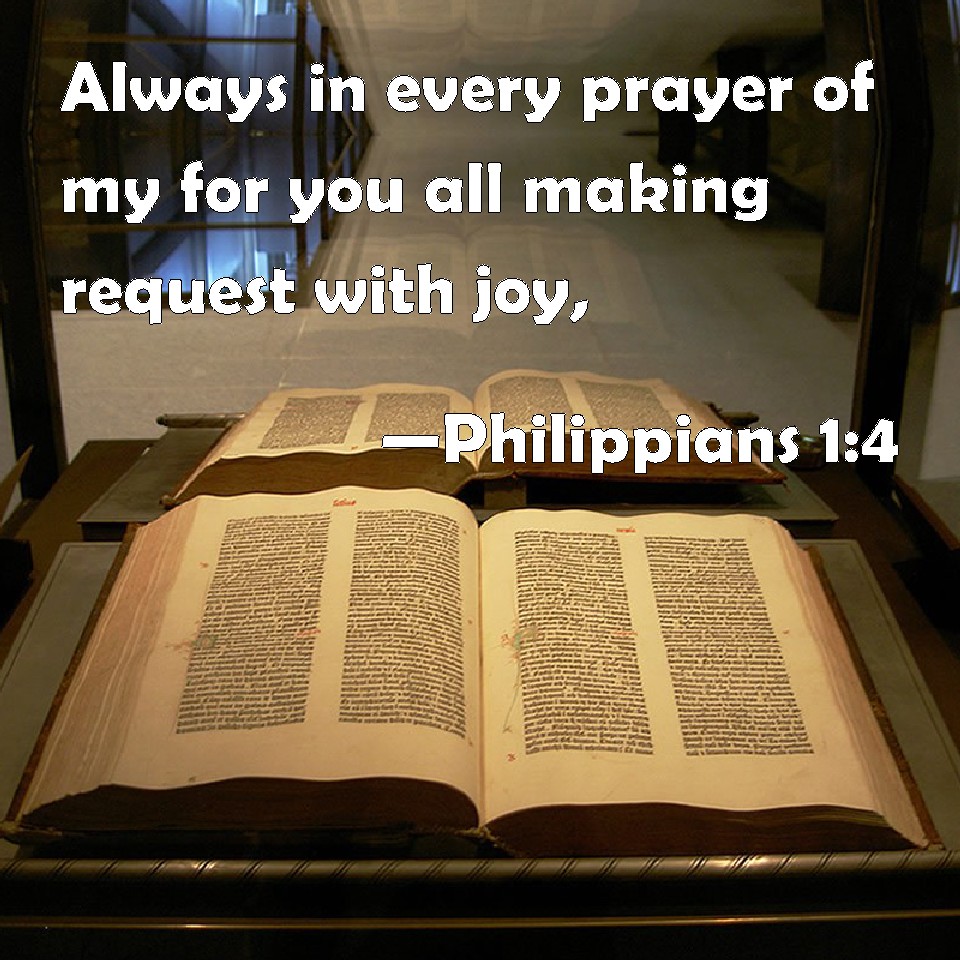 Choose a Background Philippians 1:4 Always in every prayer of my for you all making request with joy, KJV: Always in every prayer of mine for you all making request with joy, DRB: Always in all my prayers making supplication for you all, with joy; DBT: constantly in my every supplication, making the supplication for you all with joy, ERV: always in every supplication of mine on behalf of you all making my supplication with joy, WBT: Always in every prayer of mine for you all making request with joy, WEB: always in every request of mine on behalf of you all making my requests with joy, YLT: always, in every supplication of mine for you all, with joy making the supplication,Links Philippians 1:4 NIV • Philippians 1:4 NLT • Philippians 1:4 ESV • Philippians 1:4 NASB • Philippians 1:4 KJV • Philippians 1:4 Interlinear • Philippians 1:4 Commentaries • Philippians 1:4 Parallel Texts • Philippians 1:4 Bible Apps • Philippians 1:4 Parallel • Bible Hub |