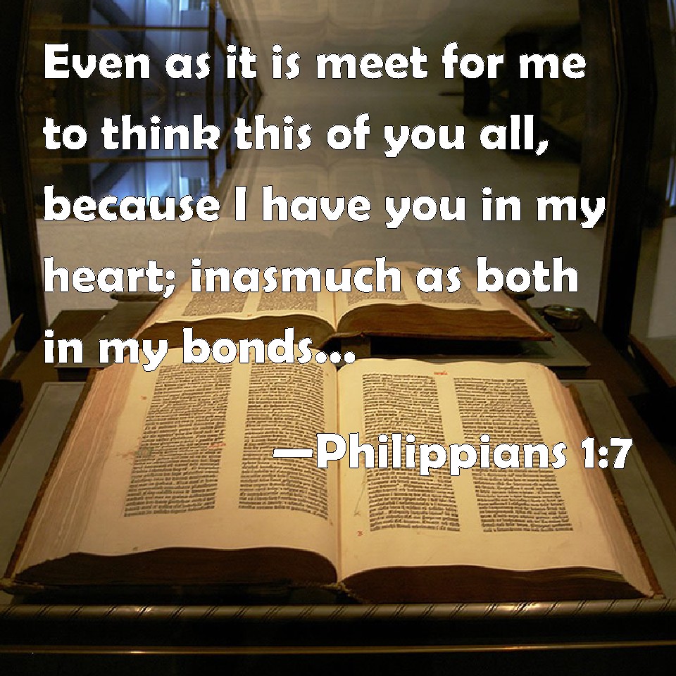 Choose a Background Philippians 1:7 Even as it is meet for me to think this of you all, because I have you in my heart; inasmuch as both in my bonds, and in the defense and confirmation of the gospel, you all are partakers of my grace. KJV: Even as it is meet for me to think this of you all, because I have you in my heart; inasmuch as both in my bonds, and in the defence and confirmation of the gospel, ye all are partakers of my grace. DRB: As it is meet for me to think this for you all, for that I have you in my heart; and that in my bands, and in the defence and confirmation of the gospel, you all are partakers of my joy. DBT: as it is righteous for me to think this as to you all, because ye have me in your hearts, and that both in my bonds and in the defence and confirmation of the glad tidings ye are all participators in my grace. ERV: even as it is right for me to be thus minded on behalf of you all, because I have you in my heart, inasmuch as, both in my bonds and in the defence and confirmation of the gospel, ye all are partakers with me of grace. WBT: Even as it is meet for me to think this of you all, because I have you in my heart; inasmuch as both in my bonds, and in the defense and confirmation of the gospel, ye all are partakers of my grace. WEB: It is even right for me to think this way on behalf of all of you, because I have you in my heart, because, both in my bonds and in the defense and confirmation of the Good News, you all are partakers with me of grace. YLT: according as it is righteous for me to think this in behalf of you all, because of my having you in the heart, both in my bonds, and in the defence and confirmation of the good news, all of you being fellow-partakers with me of grace.Links Philippians 1:7 NIV • Philippians 1:7 NLT • Philippians 1:7 ESV • Philippians 1:7 NASB • Philippians 1:7 KJV • Philippians 1:7 Interlinear • Philippians 1:7 Commentaries • Philippians 1:7 Parallel Texts • Philippians 1:7 Bible Apps • Philippians 1:7 Parallel • Bible Hub |