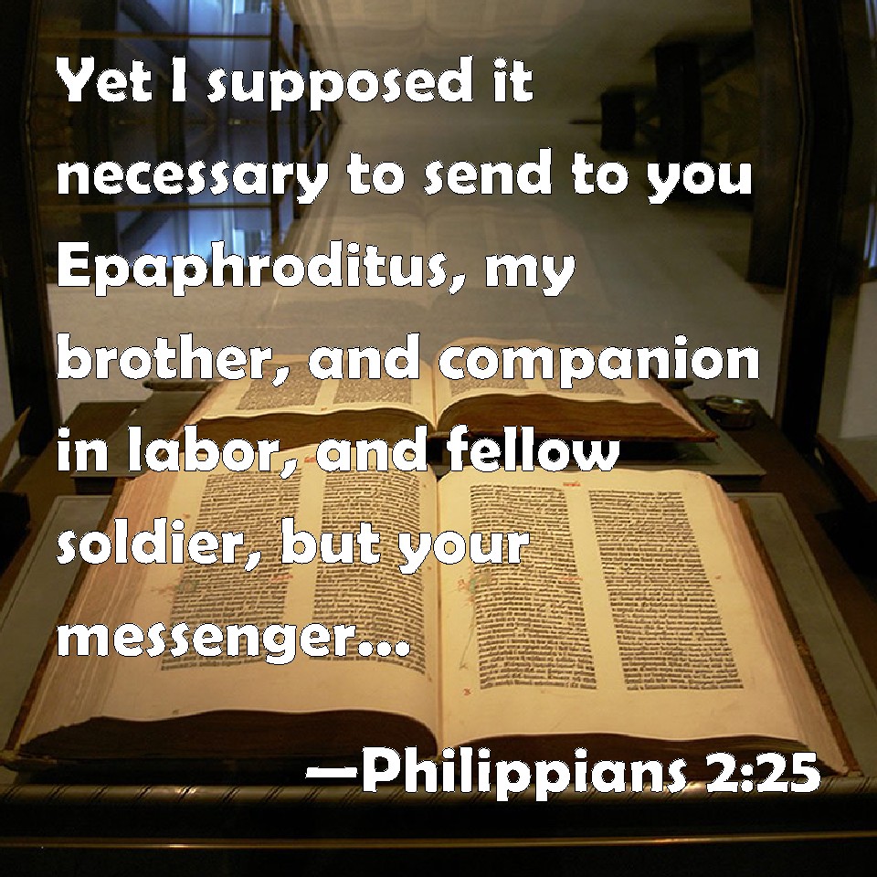 Choose a Background Philippians 2:25 Yet I supposed it necessary to send to you Epaphroditus, my brother, and companion in labor, and fellow soldier, but your messenger, and he that ministered to my wants. KJV: Yet I supposed it necessary to send to you Epaphroditus, my brother, and companion in labour, and fellowsoldier, but your messenger, and he that ministered to my wants. DRB: But I have thought it necessary to send to you Epaphroditus, my brother and fellow labourer, and fellow soldier, but your apostle, and he that hath ministered to my wants. DBT: but I have thought it necessary to send to you Epaphroditus, my brother and fellow-workman and fellow-soldier, but your messenger and minister to my need, ERV: But I counted it necessary to send to you Epaphroditus, my brother and fellow-worker and fellow-soldier, and your messenger and minister to my need; WBT: Yet I supposed it necessary to send to you Epaphroditus, my brother, and companion in labor, and fellow-soldier, but your messenger, and he that ministered to my wants. WEB: But I counted it necessary to send to you Epaphroditus, my brother, fellow worker, fellow soldier, and your apostle and servant of my need; YLT: And I thought it necessary Epaphroditus — my brother, and fellow-workman, and fellow-soldier, and your apostle and servant to my need — to send unto you,Links Philippians 2:25 NIV • Philippians 2:25 NLT • Philippians 2:25 ESV • Philippians 2:25 NASB • Philippians 2:25 KJV • Philippians 2:25 Interlinear • Philippians 2:25 Commentaries • Philippians 2:25 Parallel Texts • Philippians 2:25 Bible Apps • Philippians 2:25 Parallel • Bible Hub |