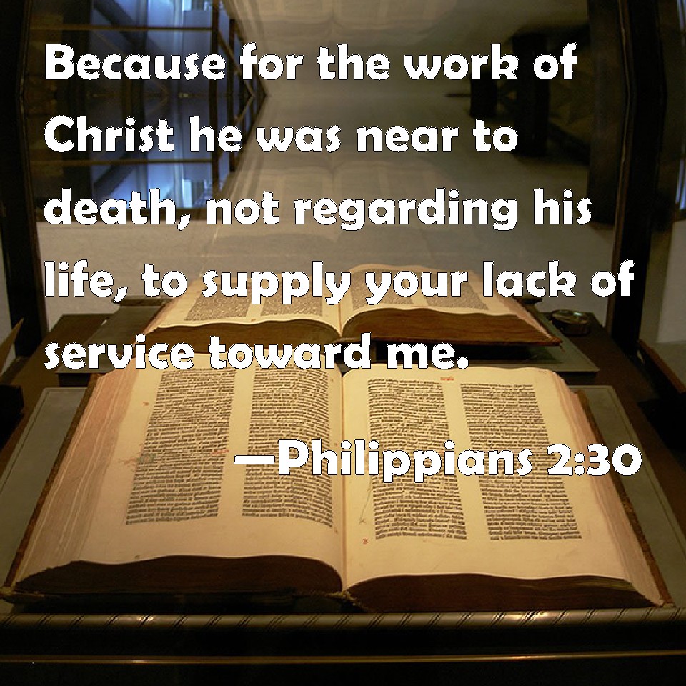 Choose a Background Philippians 2:30 Because for the work of Christ he was near to death, not regarding his life, to supply your lack of service toward me. KJV: Because for the work of Christ he was nigh unto death, not regarding his life, to supply your lack of service toward me. DRB: Because for the work of Christ he came to the point of death: delivering his life, that he might fulfil that which on your part was wanting towards my service. DBT: because for the sake of the work he drew near even to death, venturing his life that he might fill up what lacked in your ministration toward me. ERV: because for the work of Christ he came nigh unto death, hazarding his life to supply that which was lacking in your service toward me. WBT: Because for the work of Christ he was nigh to death, not regarding his life, to supply the want of your service towards me. WEB: because for the work of Christ he came near to death, risking his life to supply that which was lacking in your service toward me. YLT: because on account of the work of the Christ he drew near to death, having hazarded the life that he might fill up your deficiency of service unto me.Links Philippians 2:30 NIV • Philippians 2:30 NLT • Philippians 2:30 ESV • Philippians 2:30 NASB • Philippians 2:30 KJV • Philippians 2:30 Interlinear • Philippians 2:30 Commentaries • Philippians 2:30 Parallel Texts • Philippians 2:30 Bible Apps • Philippians 2:30 Parallel • Bible Hub |