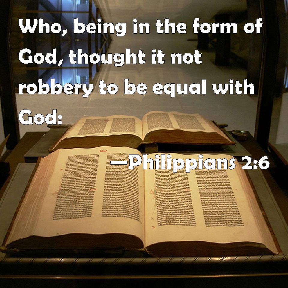 Choose a Background Philippians 2:6 Who, being in the form of God, thought it not robbery to be equal with God: KJV: Who, being in the form of God, thought it not robbery to be equal with God: DRB: Who being in the form of God, thought it not robbery to be equal with God: DBT: who, subsisting in the form of God, did not esteem it an object of rapine to be on an equality with God; ERV: who, being in the form of God, counted it not a prize to be on an equality with God, WBT: Who, being in the form of God, thought it not robbery to be equal with God: WEB: who, existing in the form of God, didn't consider equality with God a thing to be grasped, YLT: who, being in the form of God, thought it not robbery to be equal to God,Links Philippians 2:6 NIV • Philippians 2:6 NLT • Philippians 2:6 ESV • Philippians 2:6 NASB • Philippians 2:6 KJV • Philippians 2:6 Interlinear • Philippians 2:6 Commentaries • Philippians 2:6 Parallel Texts • Philippians 2:6 Bible Apps • Philippians 2:6 Parallel • Bible Hub |