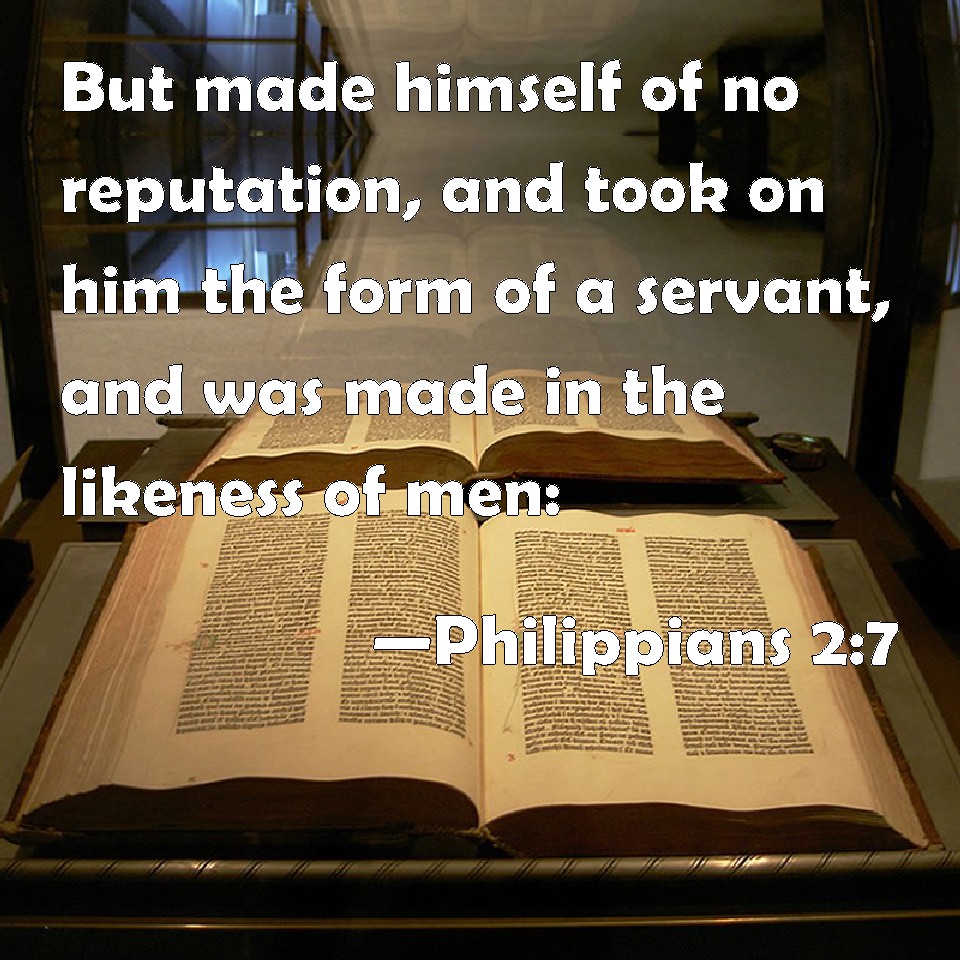 Choose a Background Philippians 2:7 But made himself of no reputation, and took on him the form of a servant, and was made in the likeness of men: KJV: But made himself of no reputation, and took upon him the form of a servant, and was made in the likeness of men: DRB: But emptied himself, taking the form of a servant, being made in the likeness of men, and in habit found as a man. DBT: but emptied himself, taking a bondman's form, taking his place in the likeness of men; ERV: but emptied himself, taking the form of a servant, being made in the likeness of men; WBT: But made himself of no reputation, and took upon him the form of a servant, and was made in the likeness of men: WEB: but emptied himself, taking the form of a servant, being made in the likeness of men. YLT: but did empty himself, the form of a servant having taken, in the likeness of men having been made,Links Philippians 2:7 NIV • Philippians 2:7 NLT • Philippians 2:7 ESV • Philippians 2:7 NASB • Philippians 2:7 KJV • Philippians 2:7 Interlinear • Philippians 2:7 Commentaries • Philippians 2:7 Parallel Texts • Philippians 2:7 Bible Apps • Philippians 2:7 Parallel • Bible Hub |