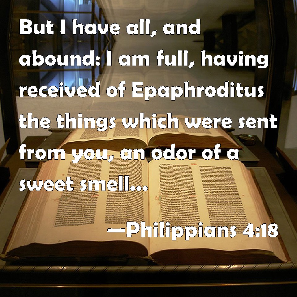 Choose a Background Philippians 4:18 But I have all, and abound: I am full, having received of Epaphroditus the things which were sent from you, an odor of a sweet smell, a sacrifice acceptable, well pleasing to God. KJV: But I have all, and abound: I am full, having received of Epaphroditus the things which were sent from you, an odour of a sweet smell, a sacrifice acceptable, wellpleasing to God. DRB: But I have all, and abound: I am filled, having received from Epaphroditus the things you sent, an odour of sweetness, an acceptable sacrifice, pleasing to God. DBT: But I have all things in full supply and abound; I am full, having received of Epaphroditus the things sent from you, an odour of sweet savour, an acceptable sacrifice, agreeable to God. ERV: But I have all things, and abound: I am filled, having received from Epaphroditus the things that came from you, an odour of a sweet smell, a sacrifice acceptable, well-pleasing to God. WBT: But I have all, and abound: I am full, having received from Epaphroditus the things which were sent from you, an odor of a sweet smell, a sacrifice acceptable, well-pleasing to God. WEB: But I have all things, and abound. I am filled, having received from Epaphroditus the things that came from you, a sweet-smelling fragrance, an acceptable and well-pleasing sacrifice to God. YLT: and I have all things, and abound; I am filled, having received from Epaphroditus the things from you — an odour of a sweet smell — a sacrifice acceptable, well-pleasing to God:Links Philippians 4:18 NIV • Philippians 4:18 NLT • Philippians 4:18 ESV • Philippians 4:18 NASB • Philippians 4:18 KJV • Philippians 4:18 Interlinear • Philippians 4:18 Commentaries • Philippians 4:18 Parallel Texts • Philippians 4:18 Bible Apps • Philippians 4:18 Parallel • Bible Hub |