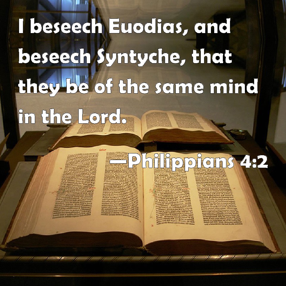 Choose a Background Philippians 4:2 I beseech Euodias, and beseech Syntyche, that they be of the same mind in the Lord. KJV: I beseech Euodias, and beseech Syntyche, that they be of the same mind in the Lord. DRB: I beg of Evodia, and I beseech Syntyche, to be of one mind in the Lord. DBT: I exhort Euodia, and exhort Syntyche, to be of the same mind in the Lord; ERV: I exhort Euodia, and I exhort Syntyche, to be of the same mind in the Lord. WBT: I beseech Euodias, and beseech Syntyche, that they be of the same mind in the Lord. WEB: I exhort Euodia, and I exhort Syntyche, to think the same way in the Lord. YLT: Euodia I exhort, and Syntyche I exhort, to be of the same mind in the Lord;Links Philippians 4:2 NIV • Philippians 4:2 NLT • Philippians 4:2 ESV • Philippians 4:2 NASB • Philippians 4:2 KJV • Philippians 4:2 Interlinear • Philippians 4:2 Commentaries • Philippians 4:2 Parallel Texts • Philippians 4:2 Bible Apps • Philippians 4:2 Parallel • Bible Hub |