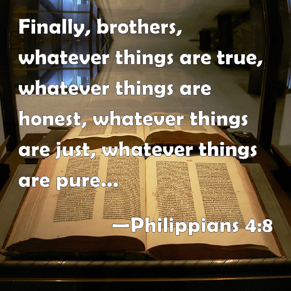 Choose a Background Philippians 4:8 Finally, brothers, whatever things are true, whatever things are honest, whatever things are just, whatever things are pure, whatever things are lovely, whatever things are of good report; if there be any virtue, and if there be any praise, think on these things. KJV: Finally, brethren, whatsoever things are true, whatsoever things are honest, whatsoever things are just, whatsoever things are pure, whatsoever things are lovely, whatsoever things are of good report; if there be any virtue, and if there be any praise, think on these things. DRB: For the rest, brethren, whatsoever things are true, whatsoever modest, whatsoever just, whatsoever holy, whatsoever lovely, whatsoever of good fame, if there be any virtue, if any praise of discipline, think on these things. DBT: For the rest, brethren, whatsoever things are true, whatsoever things are noble, whatsoever things are just, whatsoever things are pure, whatsoever things are amiable, whatsoever things are of good report; if there be any virtue and if any praise, think on these things. ERV: Finally, brethren, whatsoever things are true, whatsoever things are honourable, whatsoever things are just, whatsoever things are pure, whatsoever things are lovely, whatsoever things are of good report; if there be any virtue, and if there be any praise, think on these things. WBT: Finally, brethren, whatever things are true, whatever things are honest, whatever things are just, whatever things are pure, whatever things are lovely, whatever things are of good report; if there is any virtue, and if there is any praise, think on these things. WEB: Finally, brothers, whatever things are true, whatever things are honorable, whatever things are just, whatever things are pure, whatever things are lovely, whatever things are of good report; if there is any virtue, and if there is any praise, think about these things. YLT: As to the rest, brethren, as many things as are true, as many as are grave, as many as are righteous, as many as are pure, as many as are lovely, as many as are of good report, if any worthiness, and if any praise, these things think upon;Links Philippians 4:8 NIV • Philippians 4:8 NLT • Philippians 4:8 ESV • Philippians 4:8 NASB • Philippians 4:8 KJV • Philippians 4:8 Interlinear • Philippians 4:8 Commentaries • Philippians 4:8 Parallel Texts • Philippians 4:8 Bible Apps • Philippians 4:8 Parallel • Bible Hub |