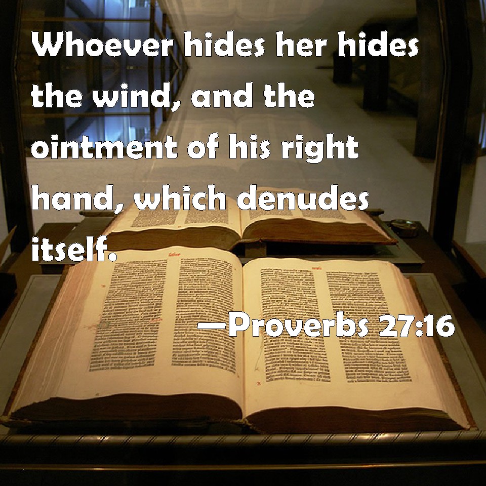 Choose a Background Proverbs 27:16 Whoever hides her hides the wind, and the ointment of his right hand, which denudes itself. KJV: Whosoever hideth her hideth the wind, and the ointment of his right hand, which bewrayeth itself. DRB: He that retaineth her, is as he that would hold the wind, and shall call in the oil of his right hand. DBT: whosoever will restrain her restraineth the wind, and his right hand encountereth oil. ERV: He that would restrain her restraineth the wind, and his right hand encountereth oil. WBT: Whoever hideth her hideth the wind, and the ointment of his right hand which bewrayeth itself. WEB: restraining her is like restraining the wind, or like grasping oil in his right hand. YLT: Whoso is hiding her hath hidden the wind, And the ointment of his right hand calleth out.Links Proverbs 27:16 NIV • Proverbs 27:16 NLT • Proverbs 27:16 ESV • Proverbs 27:16 NASB • Proverbs 27:16 KJV • Proverbs 27:16 Interlinear • Proverbs 27:16 Commentaries • Proverbs 27:16 Parallel Texts • Proverbs 27:16 Bible Apps • Proverbs 27:16 Parallel • Bible Hub |