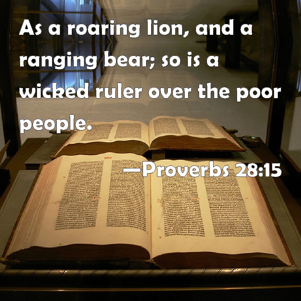 Choose a Background Proverbs 28:15 As a roaring lion, and a ranging bear; so is a wicked ruler over the poor people. KJV: As a roaring lion, and a ranging bear; so is a wicked ruler over the poor people. DRB: As a roaring lion, and a hungry bear, so is a wicked prince over the poor people. DBT: A roaring lion, and a ranging bear, is a wicked ruler over a poor people. ERV: As a roaring lion, and a ranging bear; so is a wicked ruler over a poor people. WBT: As a roaring lion, and a ranging bear; so is a wicked ruler over the poor people. WEB: As a roaring lion or a charging bear, so is a wicked ruler over helpless people. YLT: A growling lion, and a ranging bear, Is the wicked ruler over a poor people.Links Proverbs 28:15 NIV • Proverbs 28:15 NLT • Proverbs 28:15 ESV • Proverbs 28:15 NASB • Proverbs 28:15 KJV • Proverbs 28:15 Interlinear • Proverbs 28:15 Commentaries • Proverbs 28:15 Parallel Texts • Proverbs 28:15 Bible Apps • Proverbs 28:15 Parallel • Bible Hub |