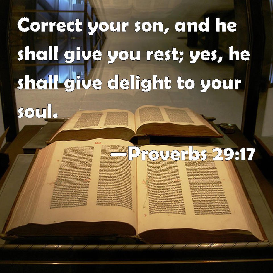 Choose a Background Proverbs 29:17 Correct your son, and he shall give you rest; yes, he shall give delight to your soul. KJV: Correct thy son, and he shall give thee rest; yea, he shall give delight unto thy soul. DRB: Instruct thy son, and he shall refresh thee, and shall give delight to thy soul. DBT: Chasten thy son, and he shall give thee rest, and shall give delight unto thy soul. ERV: Correct thy son, and he shall give thee rest; yea, he shall give delight unto thy soul. WBT: Correct thy son, and he shall give thee rest; yes, he shall give delight to thy soul. WEB: Correct your son, and he will give you peace; yes, he will bring delight to your soul. YLT: Chastise thy son, and he giveth thee comfort, Yea, he giveth delights to thy soul.Links Proverbs 29:17 NIV • Proverbs 29:17 NLT • Proverbs 29:17 ESV • Proverbs 29:17 NASB • Proverbs 29:17 KJV • Proverbs 29:17 Interlinear • Proverbs 29:17 Commentaries • Proverbs 29:17 Parallel Texts • Proverbs 29:17 Bible Apps • Proverbs 29:17 Parallel • Bible Hub |