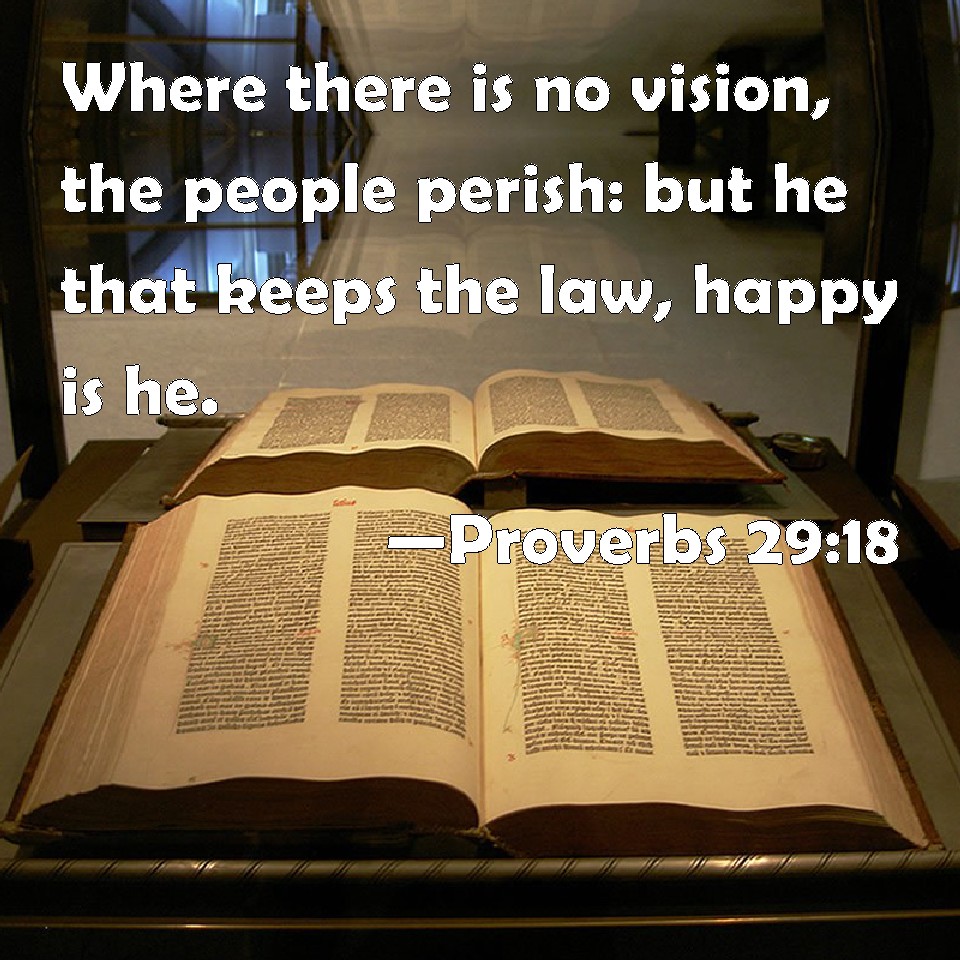 Choose a Background Proverbs 29:18 Where there is no vision, the people perish: but he that keeps the law, happy is he. KJV: Where there is no vision, the people perish: but he that keepeth the law, happy is he. DRB: When prophecy shall fail, the people shall be scattered abroad: but he that keepeth the law is blessed. DBT: Where there is no vision the people cast off restraint; but happy is he that keepeth the law. ERV: Where there is no vision, the people cast off restraint: but he that keepeth the law, happy is he. WBT: Where there is no vision, the people perish: but he that keepeth the law, happy is he. WEB: Where there is no revelation, the people cast off restraint; but one who keeps the law is blessed. YLT: Without a Vision is a people made naked, And whoso is keeping the law, O his happiness!Links Proverbs 29:18 NIV • Proverbs 29:18 NLT • Proverbs 29:18 ESV • Proverbs 29:18 NASB • Proverbs 29:18 KJV • Proverbs 29:18 Interlinear • Proverbs 29:18 Commentaries • Proverbs 29:18 Parallel Texts • Proverbs 29:18 Bible Apps • Proverbs 29:18 Parallel • Bible Hub |