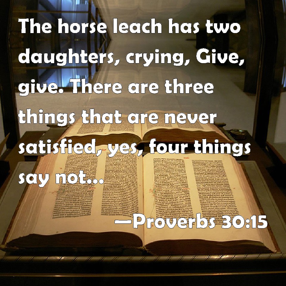 Choose a Background Proverbs 30:15 The horse leach has two daughters, crying, Give, give. There are three things that are never satisfied, yes, four things say not, It is enough: KJV: The horseleach hath two daughters, crying, Give, give. There are three things that are never satisfied, yea, four things say not, It is enough: DRB: The horseleech hath two daughters that say: Bring, bring. There are three things that never are satisfied, and the fourth never saith: It is enough. DBT: The leech hath two daughters: Give, give. There are three things never satisfied; four which say not, It is enough: ERV: The horseleach hath two daughters, Crying, Give, give. There are three things that are never satisfied, yea, four that say not, Enough: WBT: The horse-leech hath two daughters, crying, Give, give. There are three things that are never satisfied, yes, four things say not, It is enough: WEB: "The leach has two daughters: 'Give, give.' "There are three things that are never satisfied; four that don't say, 'Enough:' YLT: To the leech are two daughters, 'Give, give, Lo, three things are not satisfied, Four have not said 'Sufficiency;'Links Proverbs 30:15 NIV • Proverbs 30:15 NLT • Proverbs 30:15 ESV • Proverbs 30:15 NASB • Proverbs 30:15 KJV • Proverbs 30:15 Interlinear • Proverbs 30:15 Commentaries • Proverbs 30:15 Parallel Texts • Proverbs 30:15 Bible Apps • Proverbs 30:15 Parallel • Bible Hub |