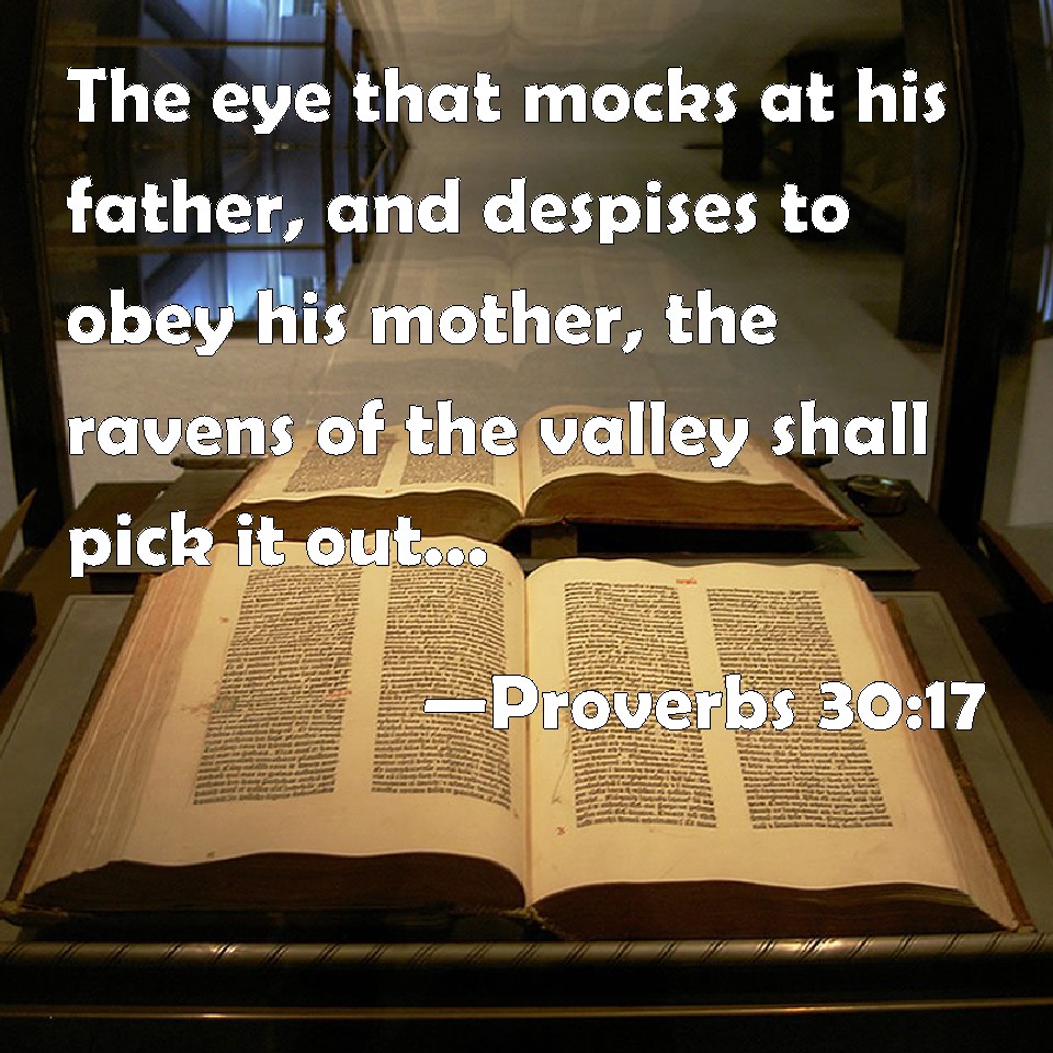 Choose a Background Proverbs 30:17 The eye that mocks at his father, and despises to obey his mother, the ravens of the valley shall pick it out, and the young eagles shall eat it. KJV: The eye that mocketh at his father, and despiseth to obey his mother, the ravens of the valley shall pick it out, and the young eagles shall eat it. DRB: The eye that mocketh at his father, and that despiseth the labour of his mother in bearing him, let the ravens of the brooks pick it out, and the young eagles eat it. DBT: The eye that mocketh at a father, and despiseth to obey a mother, the ravens of the valley shall pick it out, and the young eagles shall eat it. ERV: The eye that mocketh at his father, and despiseth to obey his mother, the ravens of the valley shall pick it out, and the young eagles shall eat it. WBT: The eye that mocketh at its father, and despiseth to obey its mother, the ravens of the valley shall pick it out, and the young eagles shall eat it. WEB: "The eye that mocks at his father, and scorns obedience to his mother: the ravens of the valley shall pick it out, the young eagles shall eat it. YLT: An eye that mocketh at a father, And despiseth to obey a mother, Dig it out do ravens of the valley, And eat it do young eagles.Links Proverbs 30:17 NIV • Proverbs 30:17 NLT • Proverbs 30:17 ESV • Proverbs 30:17 NASB • Proverbs 30:17 KJV • Proverbs 30:17 Interlinear • Proverbs 30:17 Commentaries • Proverbs 30:17 Parallel Texts • Proverbs 30:17 Bible Apps • Proverbs 30:17 Parallel • Bible Hub |