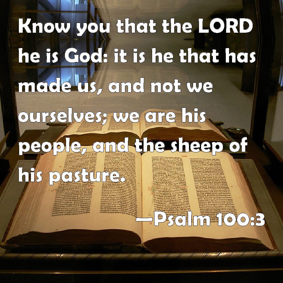 Choose a Background Psalm 100:3 Know you that the LORD he is God: it is he that has made us, and not we ourselves; we are his people, and the sheep of his pasture. KJV: Know ye that the LORD he is God: it is he that hath made us, and not we ourselves; we are his people, and the sheep of his pasture. DRB: Know ye that the Lord he is God: he made us, and not we ourselves. We are his people and the sheep of his pasture. DBT: Know that Jehovah is God: it is he that hath made us, and not we ourselves; we are his people, and the sheep of his pasture. ERV: Know ye that the LORD he is God: it is he that hath made us, and we are his; we are his people, and the sheep of his pasture. WBT: Know ye that the LORD he is God: it is he that hath made us, and not we ourselves; we are his people, and the sheep of his pasture. WEB: Know that Yahweh, he is God. It is he who has made us, and we are his. We are his people, and the sheep of his pasture. YLT: Know that Jehovah He is God, He made us, and we are His, His people — and the flock of His pasture.Links Psalm 100:3 NIV • Psalm 100:3 NLT • Psalm 100:3 ESV • Psalm 100:3 NASB • Psalm 100:3 KJV • Psalm 100:3 Interlinear • Psalm 100:3 Commentaries • Psalm 100:3 Parallel Texts • Psalm 100:3 Bible Apps • Psalm 100:3 Parallel • Bible Hub |